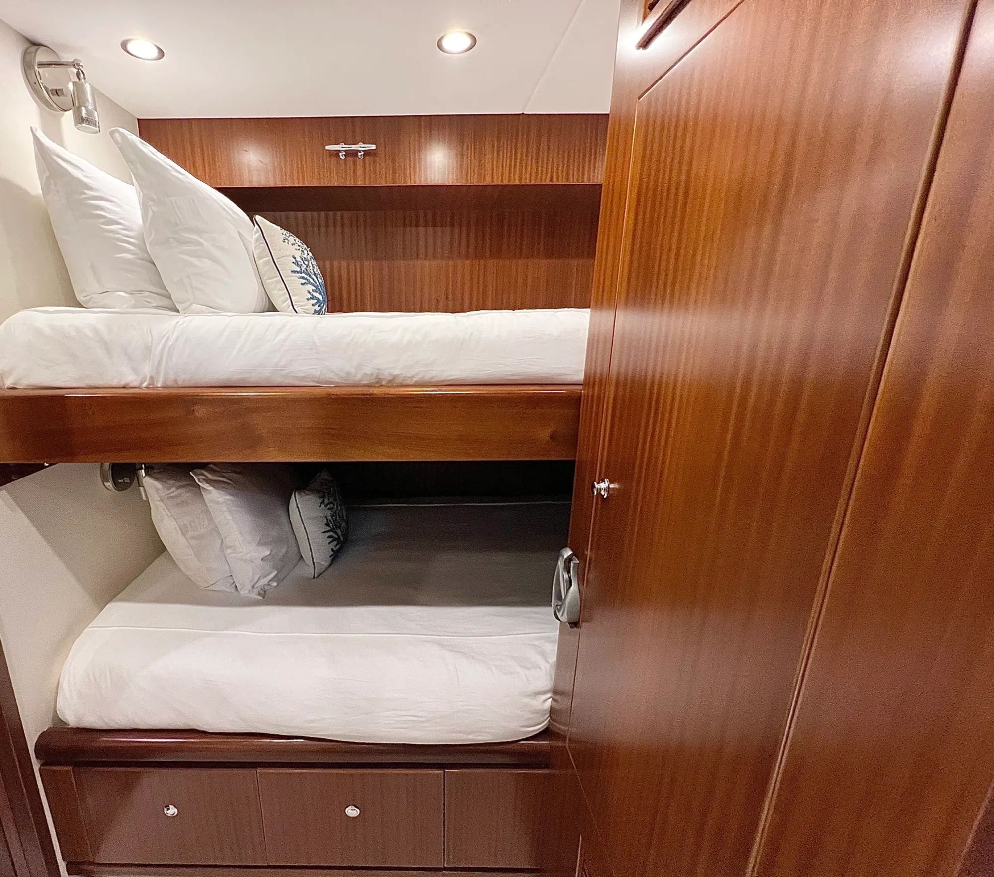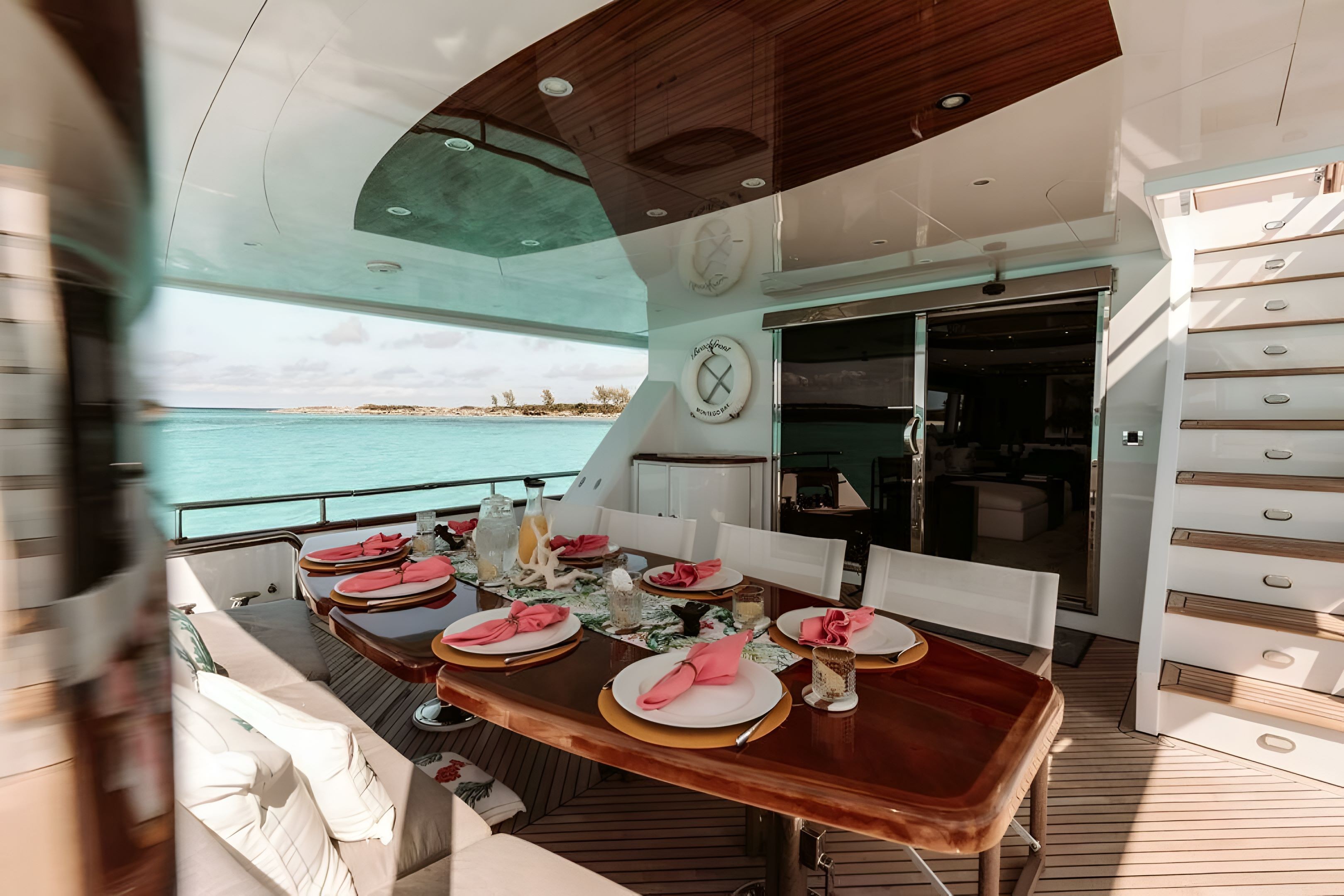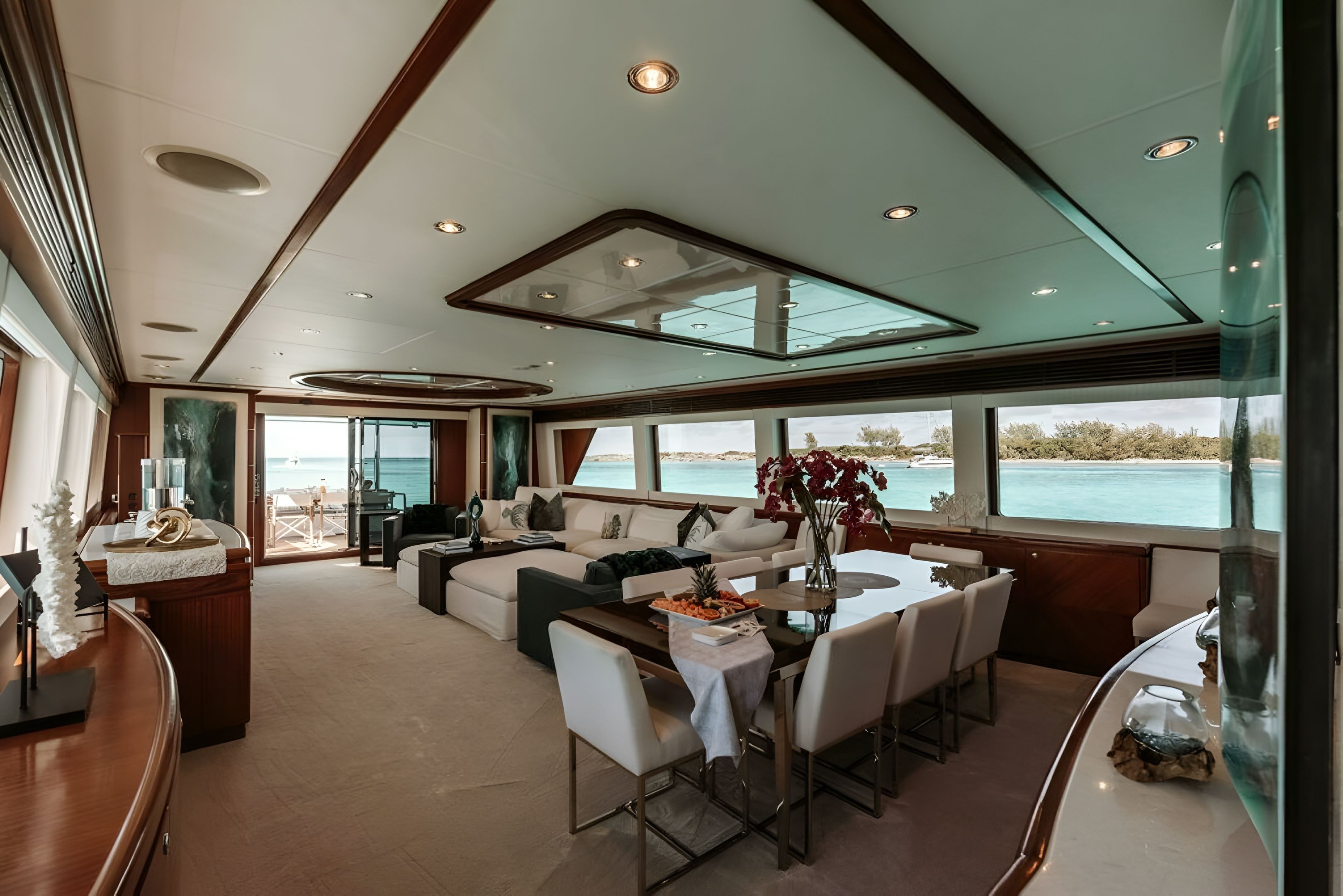 Built by Hargrave Yachts, Yacht Beachfront measures 108 feet in length. It was originally constructed in 2006, and later underwent a full refit in 2022. The interior design of Yacht Beachfront, which is the work of Lynn Levy, is equal parts stylish and contemporary. Throughout the yacht’s interiors, guests onboard will find a light and airy design scheme, one centering around a large, open-plan salon and dining room with neutral textiles. The dining room is well-appointed with an elegant table and high-back chairs, while a country-style kitchen gives guests a place to relax in a calmer, more casual setting. Panoramic windows surround the main deck, letting in ample natural light. When the sun goes down, a state-of-the-art entertainment system in the salon is the perfect way to relax on a night in. Outside, Yacht Beachfront is just as beautiful. A shaded aft deck, right next to the salon, has al fresco dining surrounded by plenty of seating. The main wraparound deck leads to more seating and lounge areas on the foredeck, while the upper sundeck is complemented by cocktail tables, a large Jacuzzi and ample chaise lounges. The more active guests onboard will appreciate the extended swim platform; the perfect starting point to jump off and take advantage of the yacht’s countless water toys.