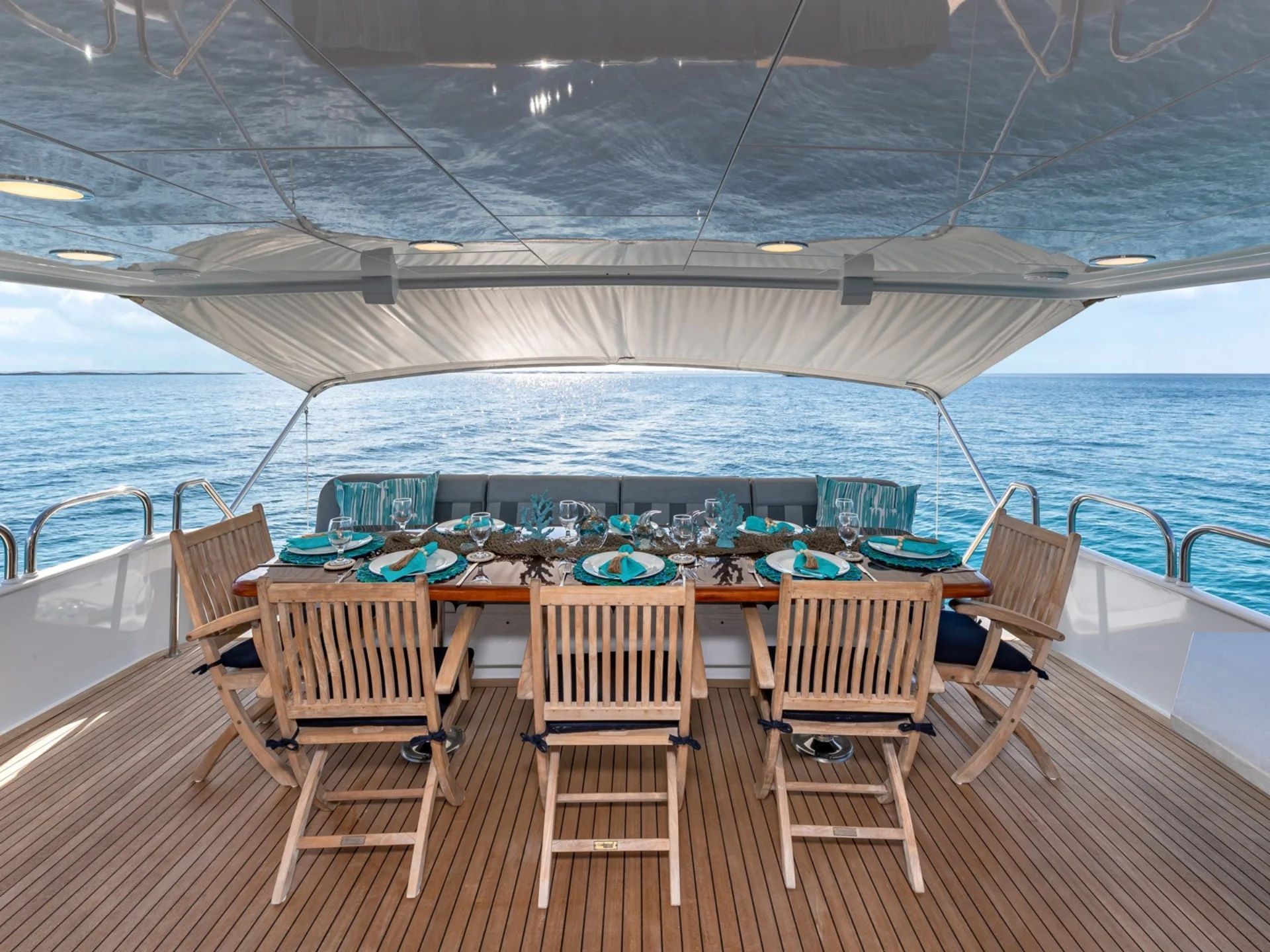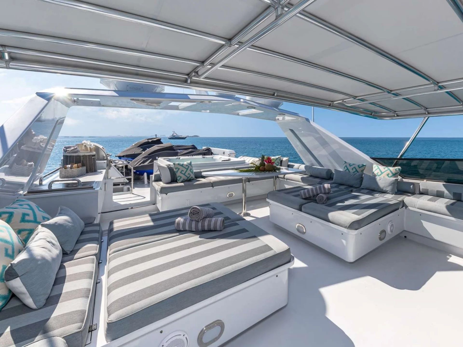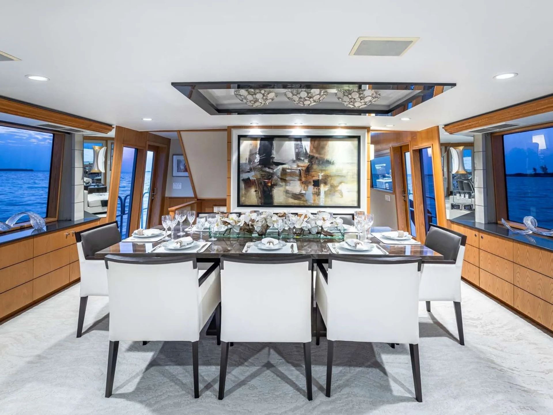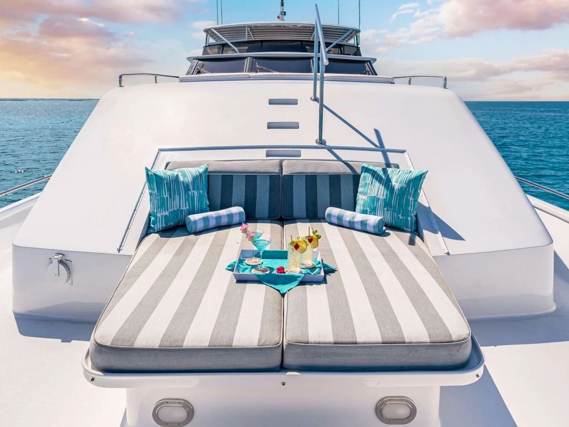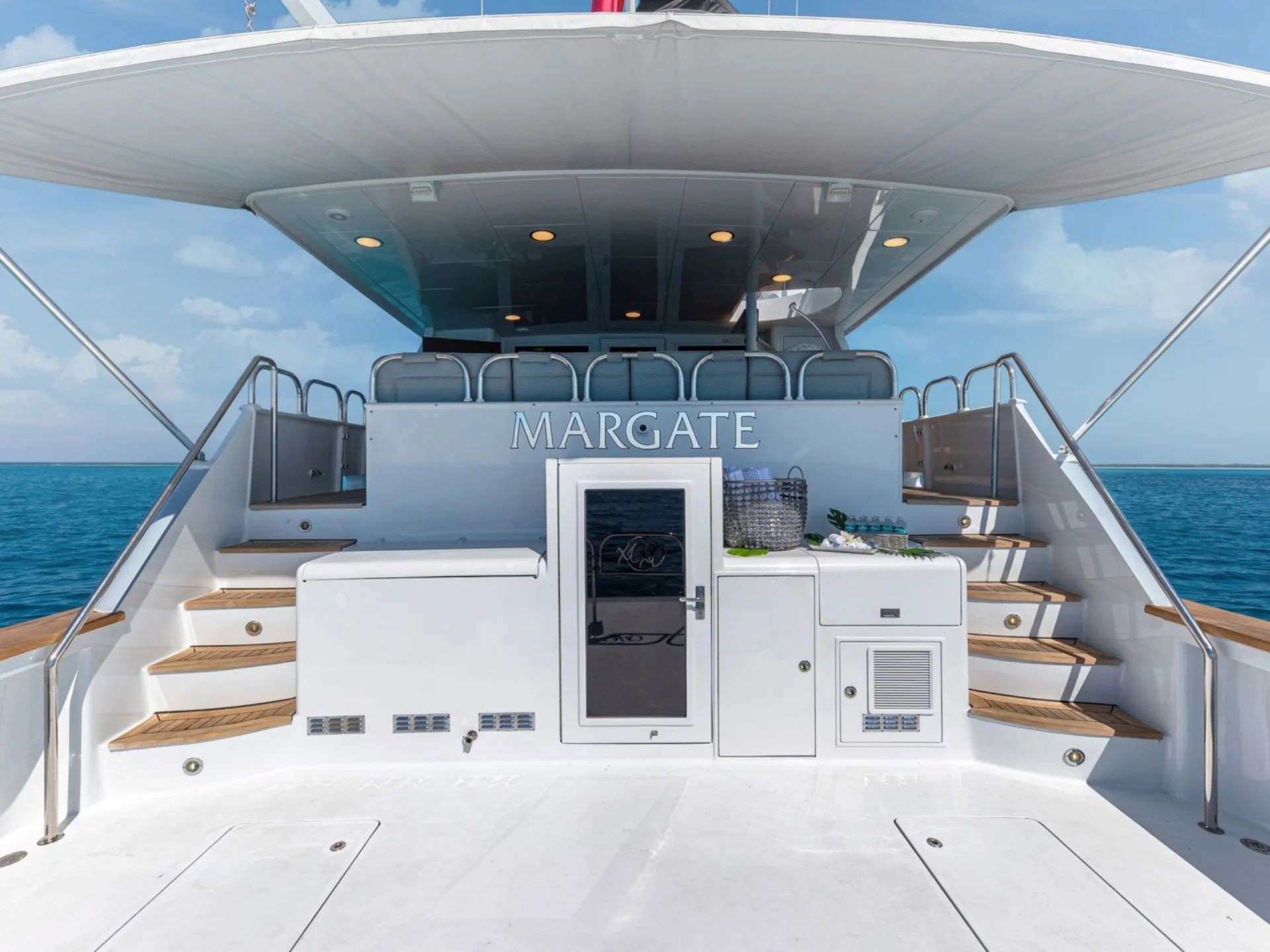 Yacht MARGATE is a 111’ yacht built by luxury yacht builder Broward Marine in 1997 and refit in 2022. With a sleek interior style by Patrick Knowles and a Jacuzzi on deck, this yacht offers cherished memories at sea while discovering diverse coastlines and secluded Caribbean islands. Days spent within MARGATE’s contemporary elegance complete a luxurious sea-faring lifestyle. Her salon hosts a spacious seating arrangement and sit-down bar for easy entertainment within stylish interior settings. A dining table invites all guests to share exquisite cuisines served up by a master chef, while a classic Broward country kitchen provides a more casual dining space and a fun place to converse with the chef. The delights of MARGATE’s exterior extend beyond the luxurious deck jacuzzi. Her main deck offers the perfect setting for seaside dining with the most memorable toasts from sunrise to sunset, while her flybridge charms with various seating arrangements designed in chic red, white, and blue stripe patterns. A more casual dining arrangement can be found in the flybridge as well as ample seating for lounging in the sun or shade.