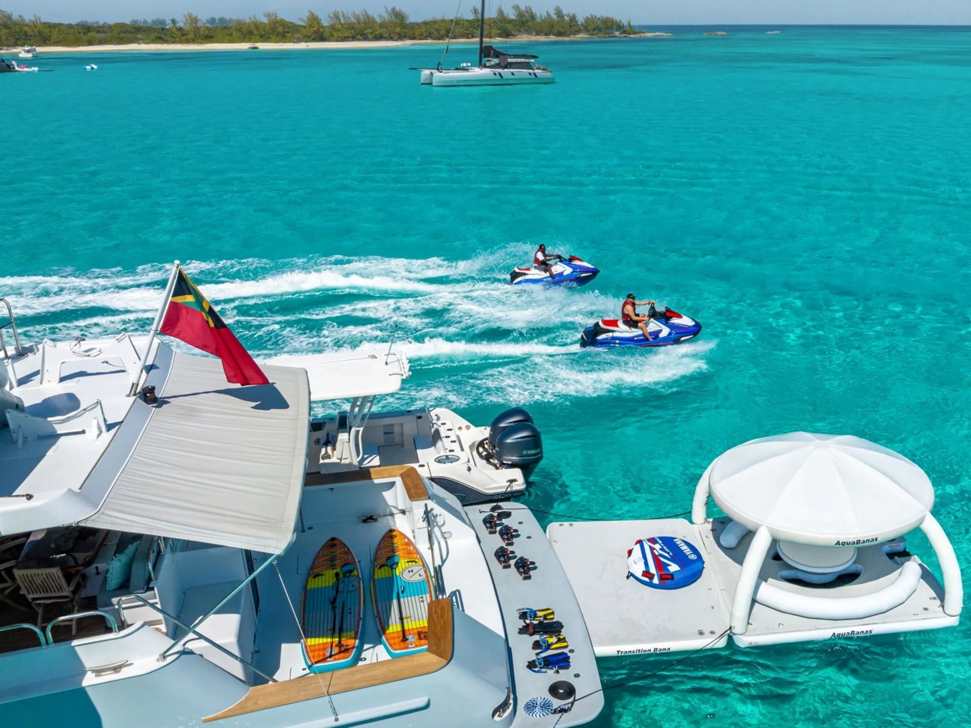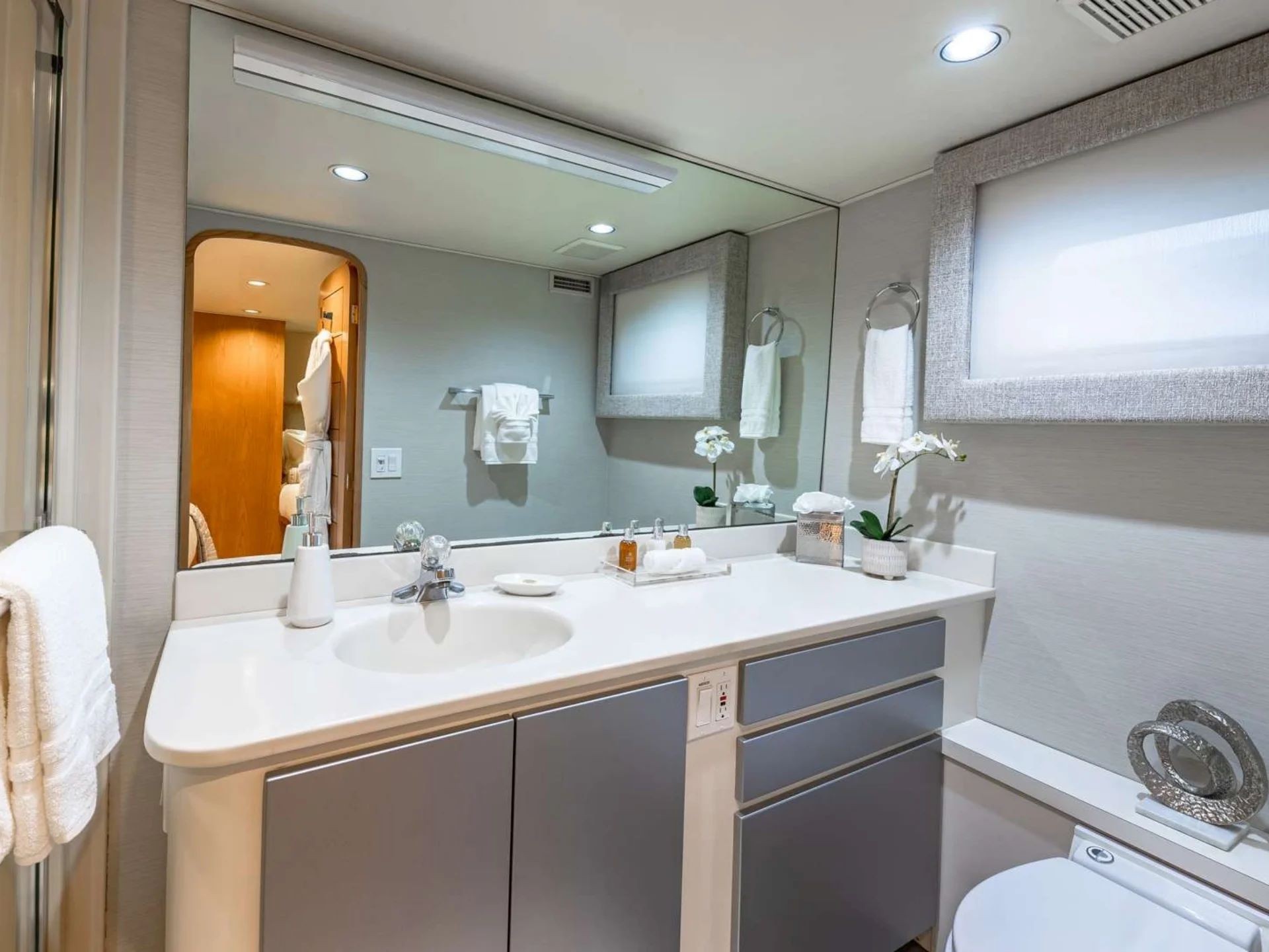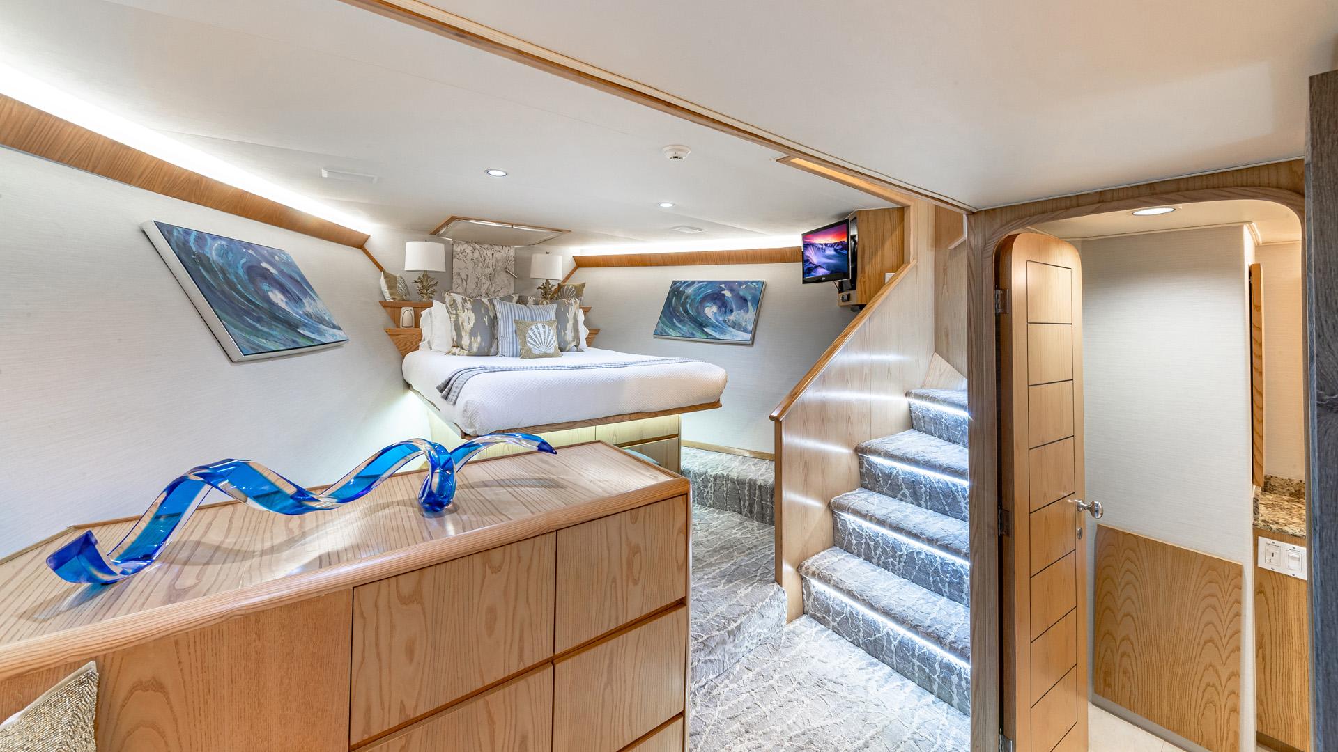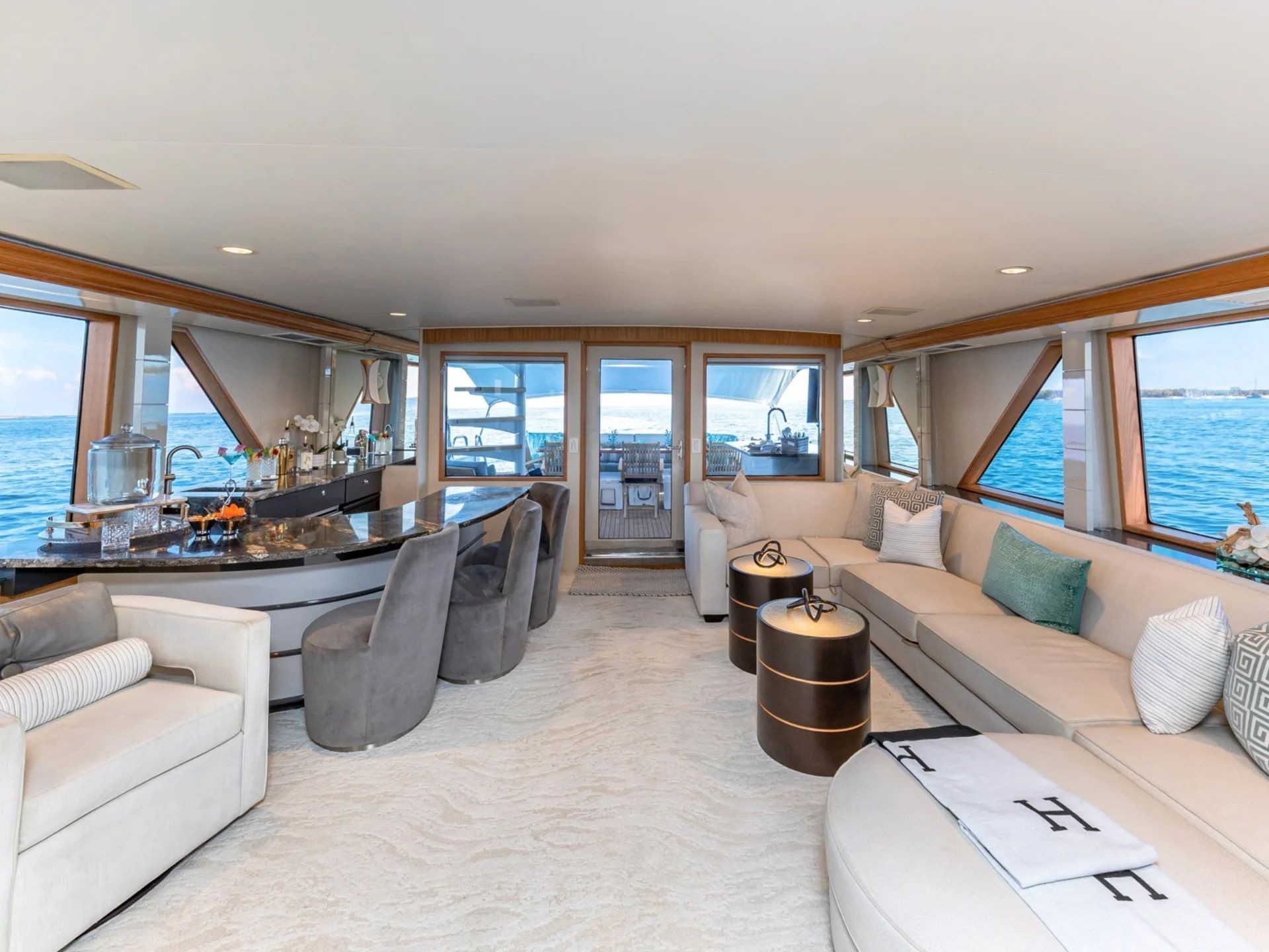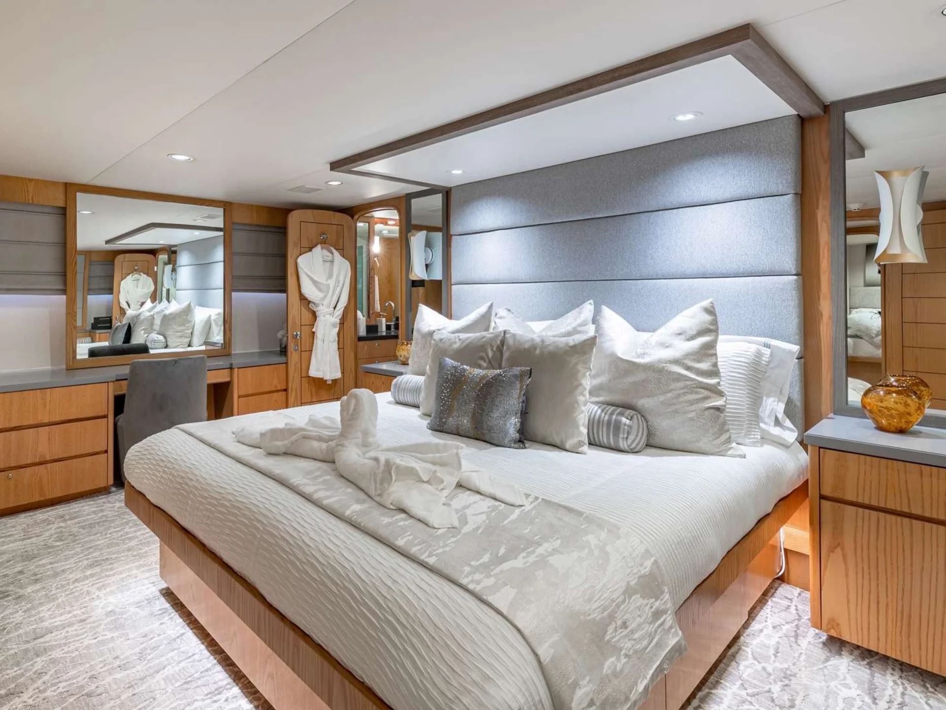 Yacht MARGATE is a 111’ yacht built by luxury yacht builder Broward Marine in 1997 and refit in 2022. With a sleek interior style by Patrick Knowles and a Jacuzzi on deck, this yacht offers cherished memories at sea while discovering diverse coastlines and secluded Caribbean islands. Days spent within MARGATE’s contemporary elegance complete a luxurious sea-faring lifestyle. Her salon hosts a spacious seating arrangement and sit-down bar for easy entertainment within stylish interior settings. A dining table invites all guests to share exquisite cuisines served up by a master chef, while a classic Broward country kitchen provides a more casual dining space and a fun place to converse with the chef. The delights of MARGATE’s exterior extend beyond the luxurious deck jacuzzi. Her main deck offers the perfect setting for seaside dining with the most memorable toasts from sunrise to sunset, while her flybridge charms with various seating arrangements designed in chic red, white, and blue stripe patterns. A more casual dining arrangement can be found in the flybridge as well as ample seating for lounging in the sun or shade.