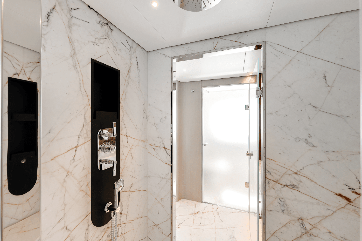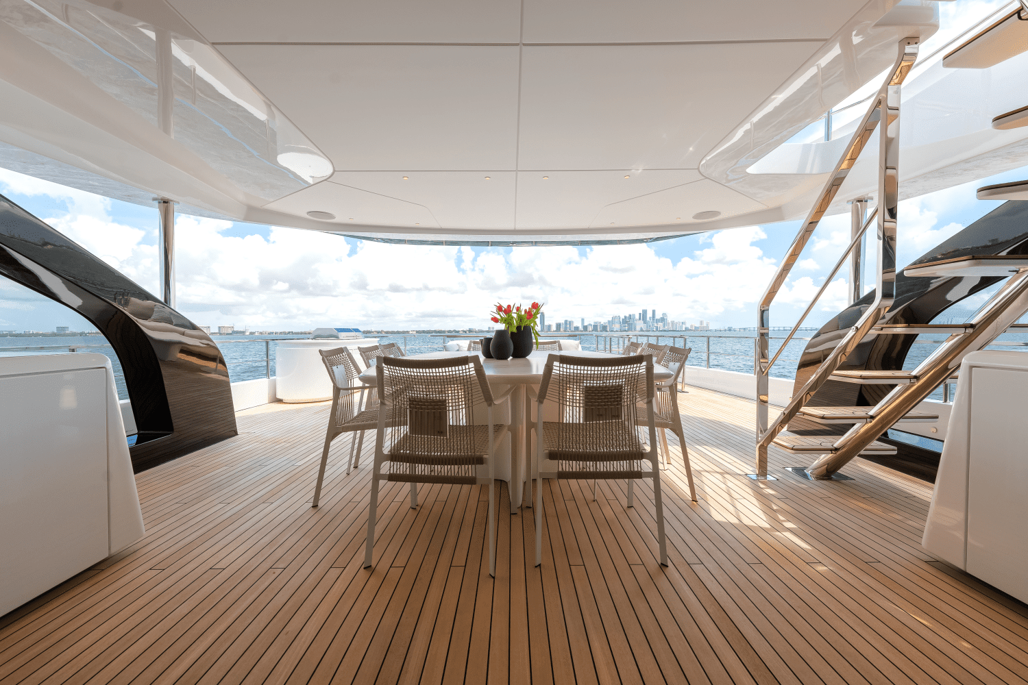 With her original design and modern ethos, the Grande 36M is a superyacht that synthesizes cutting-edge style and attitude. From the unprecedented semi-walkaround upper deck inspiring freedom of movement to the fully retractable side windows posing a special gateway to the sea, all elements contribute to visually blend interior and exterior spaces. A barrierless lifestyle naturally blurs the boundaries between onboard pleasure and oceanic greatness.