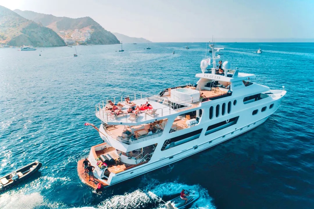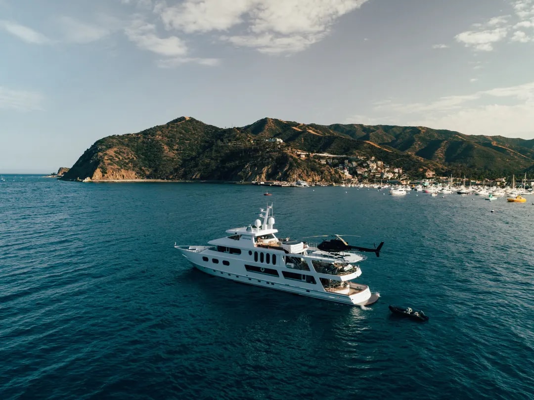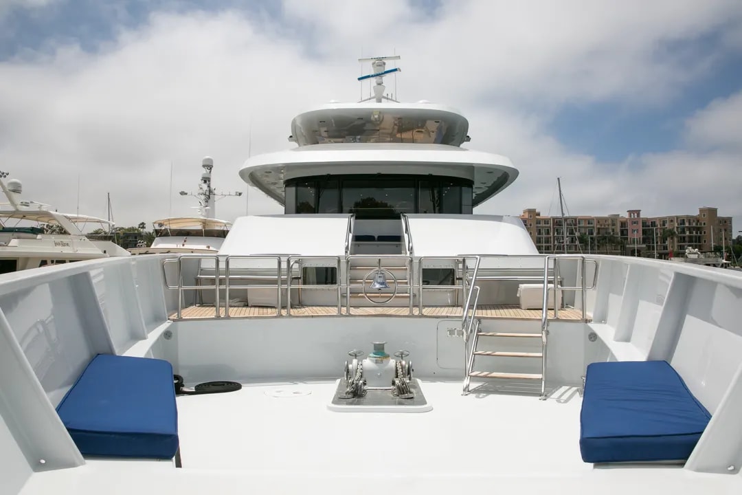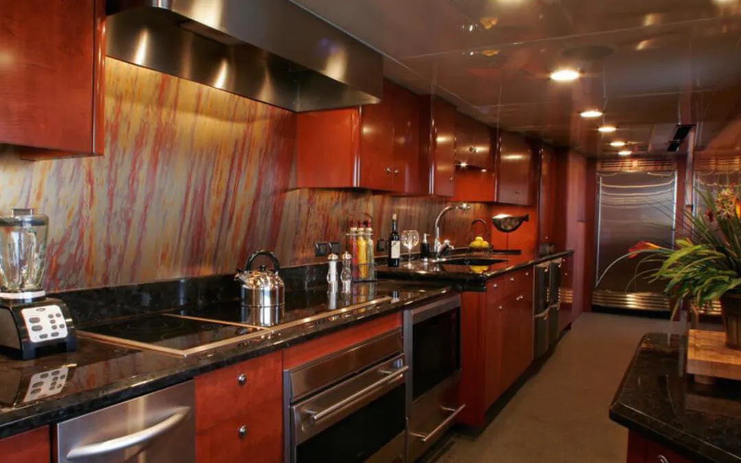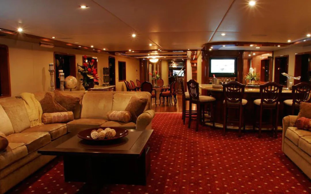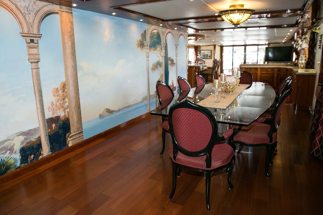This gorgeous Mega Yacht has accommodations for up to 10 guests sleeping in 4 Double and 1 Twin cabin. Her Master cabin located on the main deck forward has a King sized bed, a 40flat screen television, and fireplace setting. The amazing en suite has 2 copper sinks, a Jacuzzi tub and a private shower & toilet plus a 25 inch flat screen and heated marble floors. All remaining guest cabins are below Amidship and include 3 Queen cabins and one twin cabin each with a 25 inch flat screen TV and en suite. She also benefits from an exercise room located amidships aft with a 50 inch T flat screen TV. There is also a steam room in bathroom area. Her main saloon features spacious seating areas and a great entertainment center. She has an adjacent formal dining salon which seats up to 10 guests.