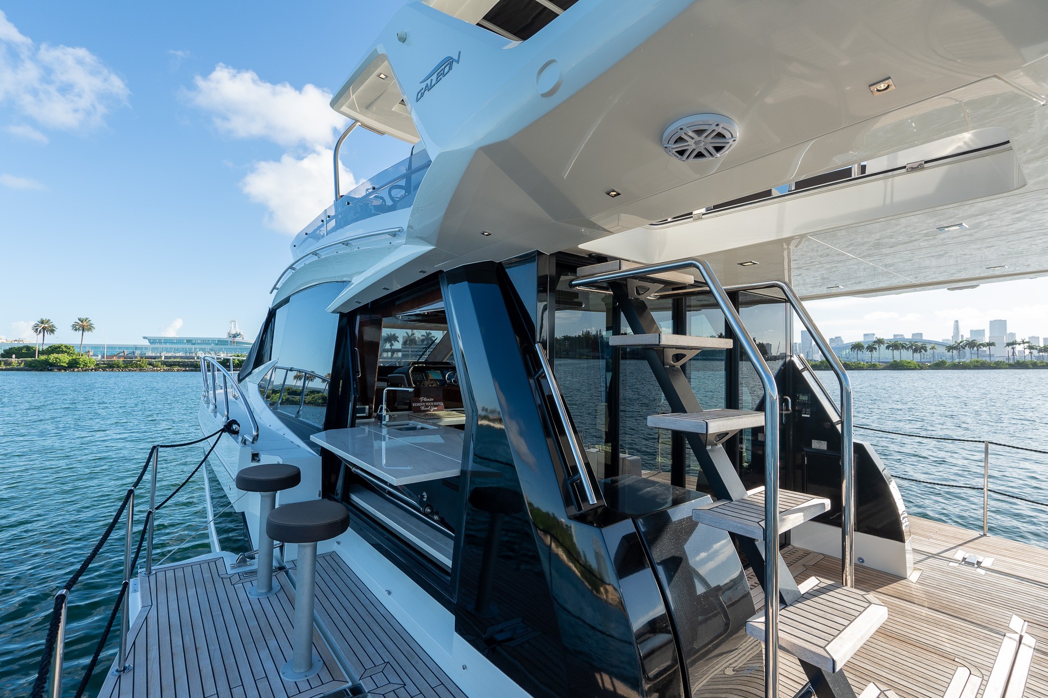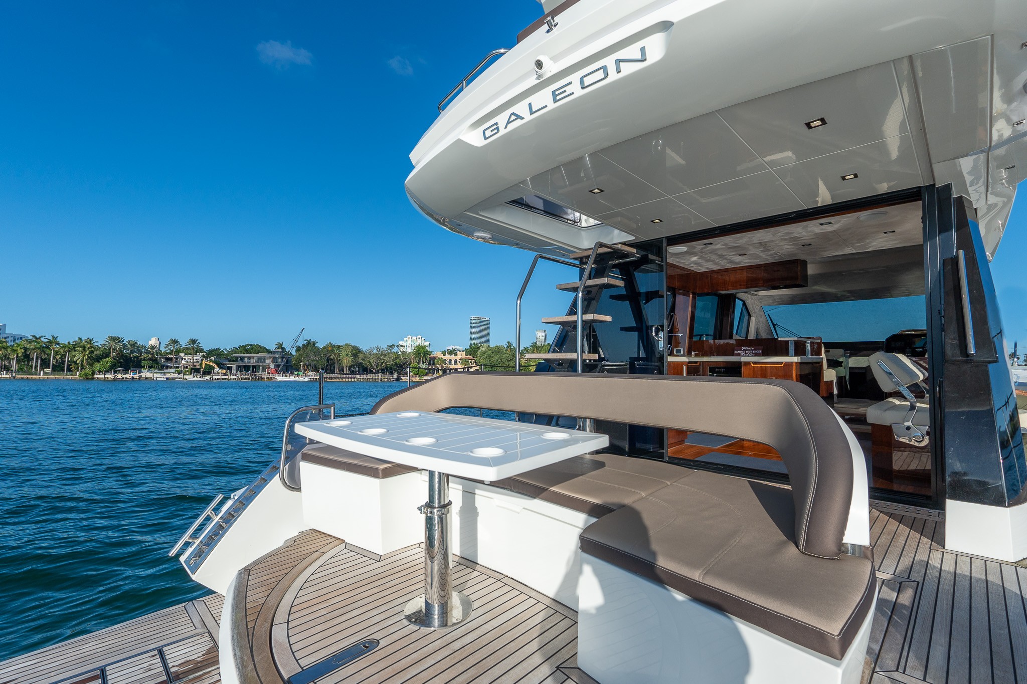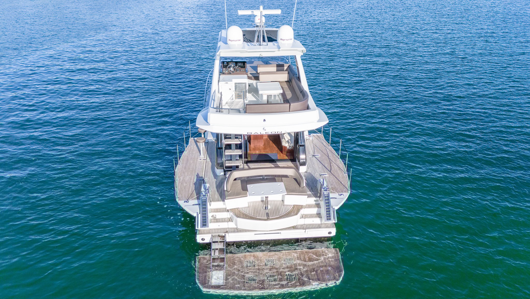 The Galeon 500 Fly is a luxurious, mid-sized motor yacht known for its innovative design and impressive versatility. It features a dynamic exterior with large windows and sleek lines. One of its standout features is the "beach mode," where fold-out balconies on both sides expand the deck space, creating a unique open-air experience. The interior is equally luxurious, with high-quality finishes, spacious living areas, and state-of-the-art technology. The flybridge offers additional seating and entertainment space, making it perfect for socializing and enjoying panoramic views. Ideal for both long cruises and day trips, the Galeon 500 Fly combines style, comfort, and performance.