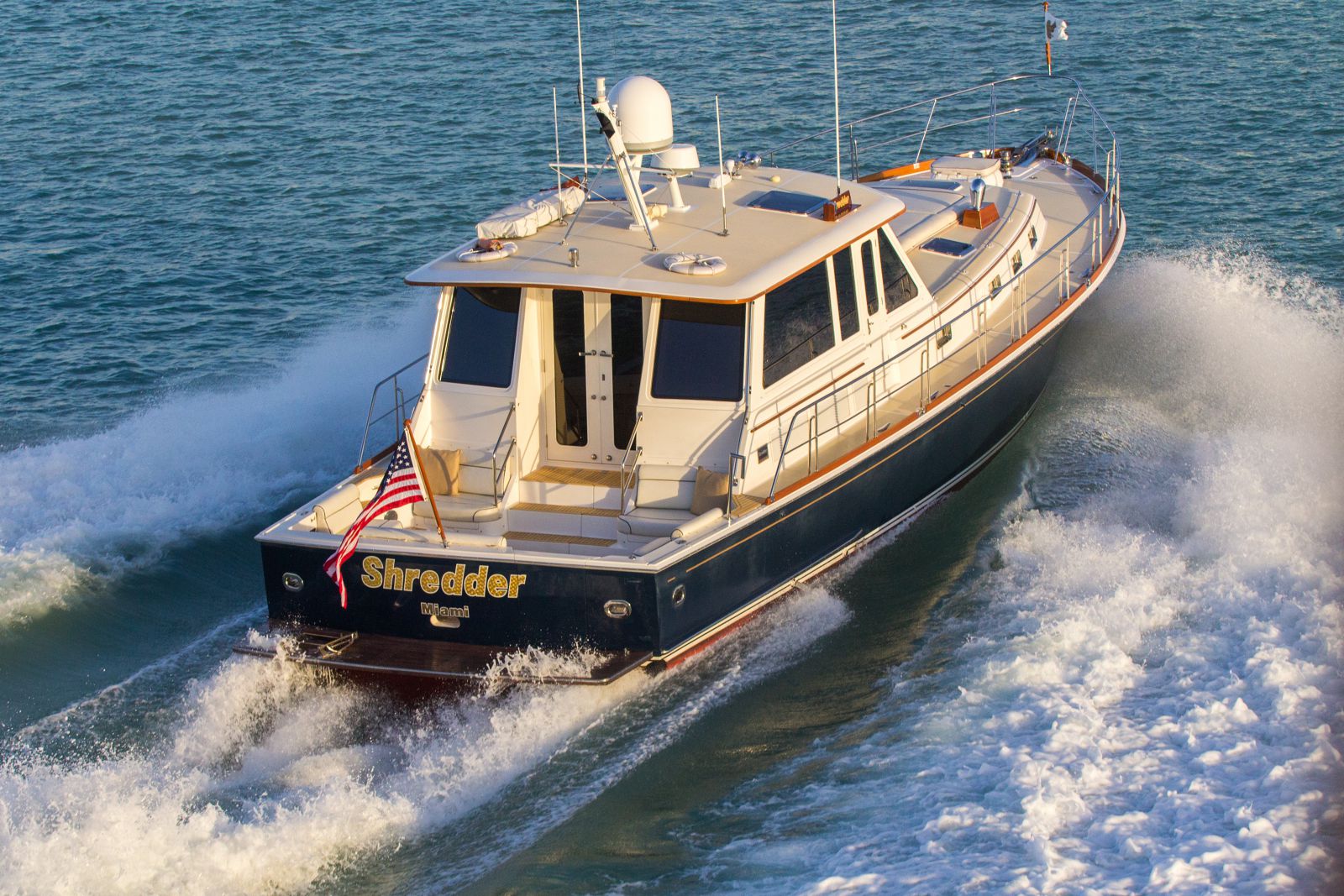 Built by Grand Banks, the 54 ft Shredder is a model of the prestigious Eastbay Series of Downeast-style cruisers. Featuring two staterooms including a large master and equally spacious VIP stateroom, Shredder is ideal for multi-day or week-long cruises for a couple. Up to twelve guests can enjoy Shredder’s light and airy main salon and comfortable accommodations for half or full-day charters. A terrific selection of water toys ensures that guests will enjoy the warm Miami waters where something is always waiting to be discovered. Shredder is ideal for day excursions to remote coves for romantic dinners, water activities or on-land exploration.