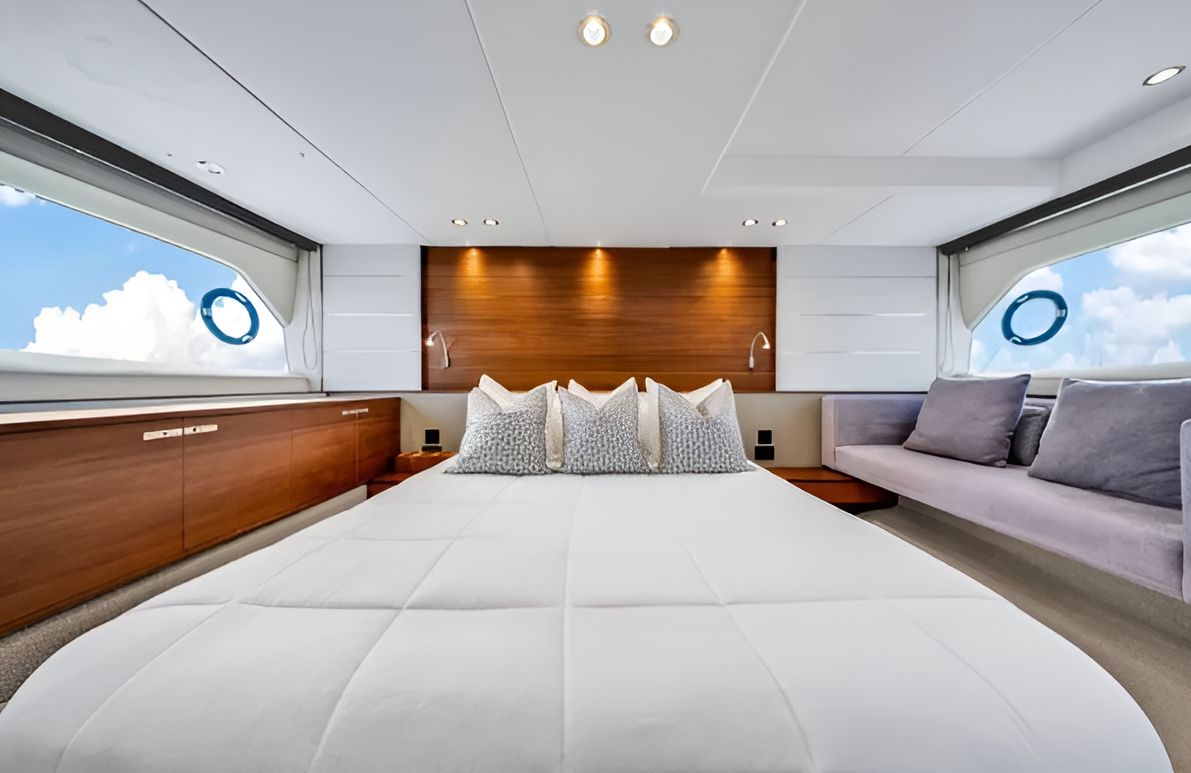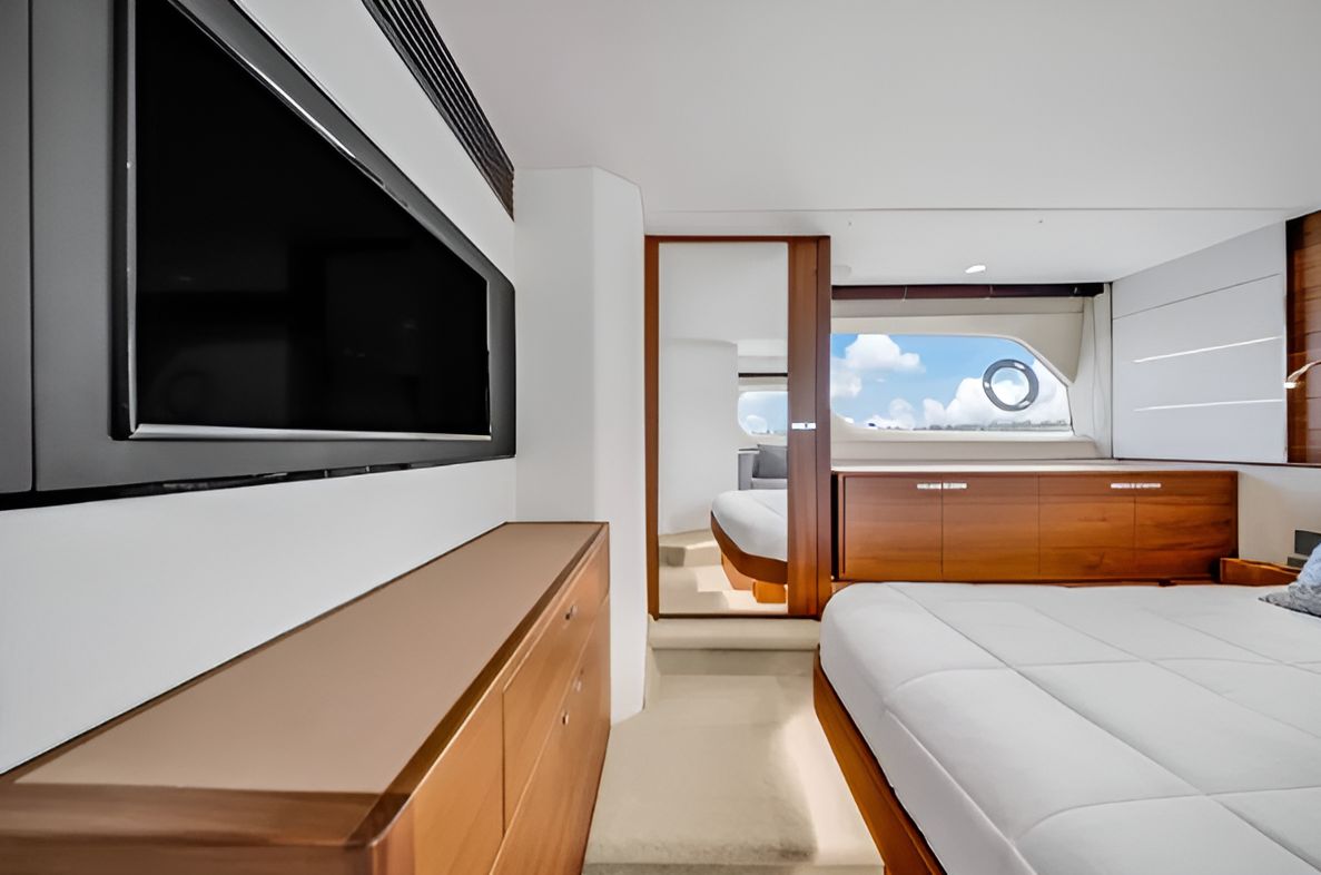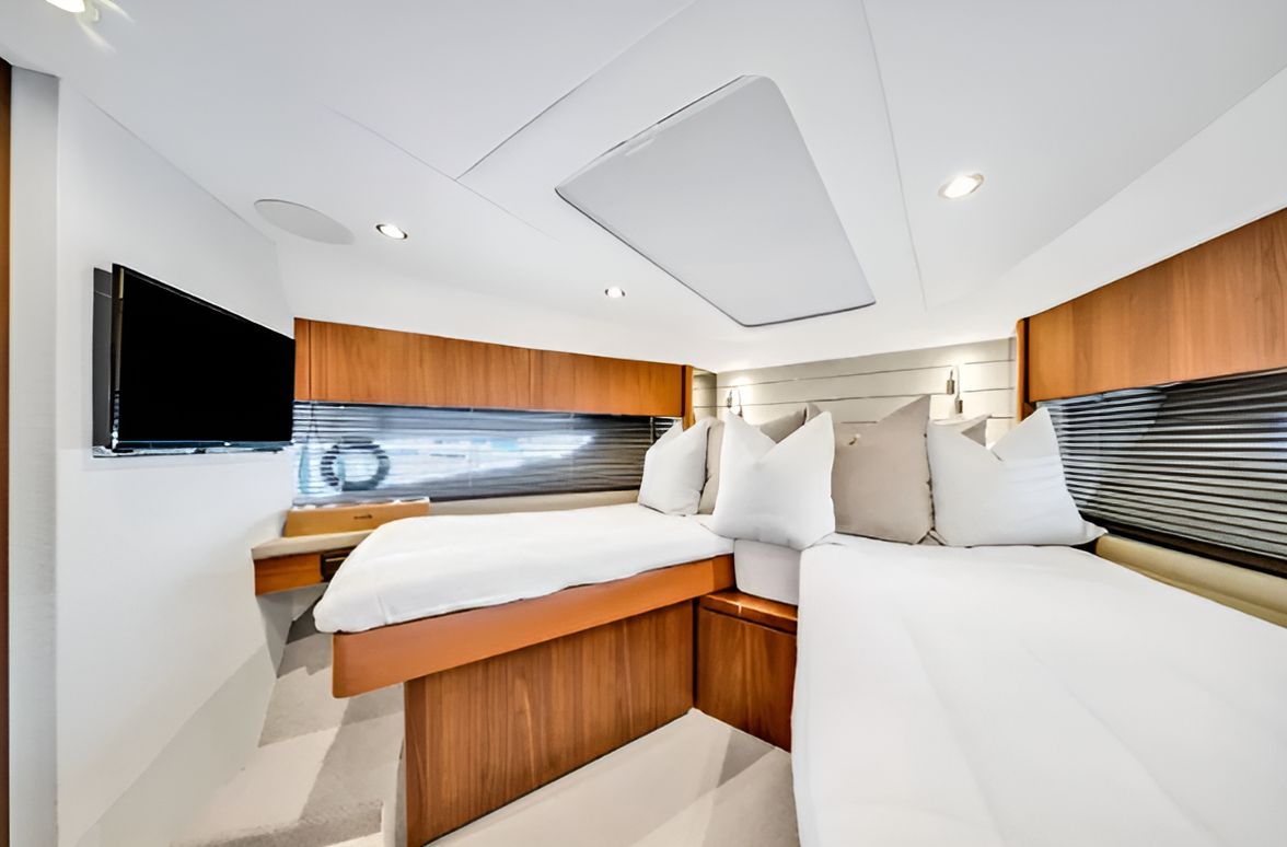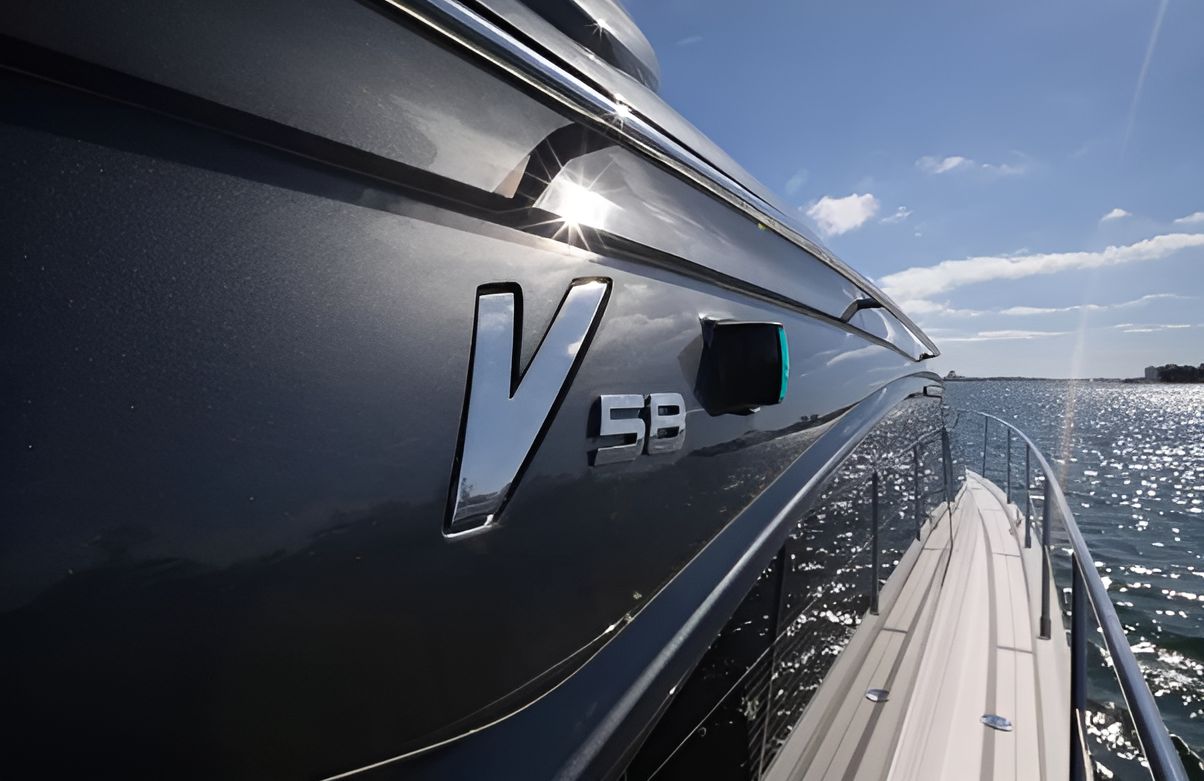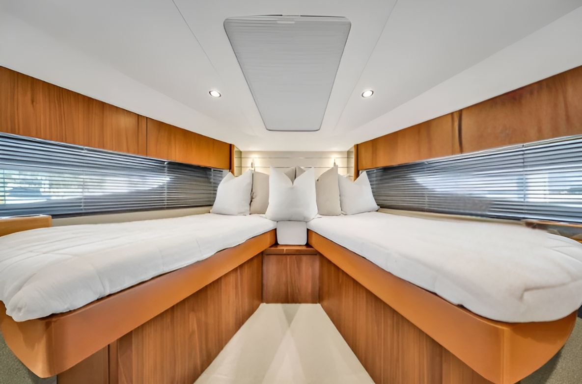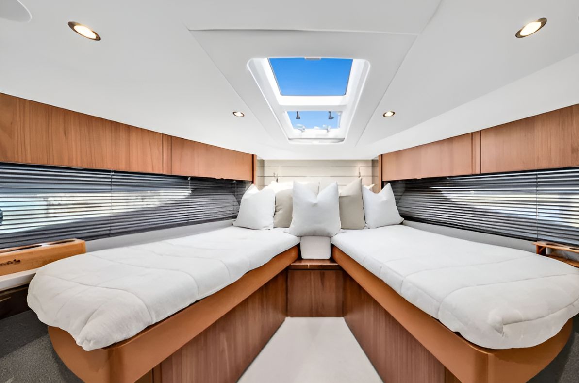 The V58 showcases dynamic exterior styling as well as offering the high performance synonymous with all V Class sports yachts. Fitted with twin Volvo D13-900 engines, the V58 is capable of achieving speeds of up to 37 knots. The main deck saloon comes complete with a generous U-shaped sofa around a dining table with a sideboard unit with glass and bottle storage and refrigerator opposite as well as a 46″ LED TV on an electric raise/lower mechanism. Below decks her large hull windows let light pour into the beautifully crafted lower accommodation.
