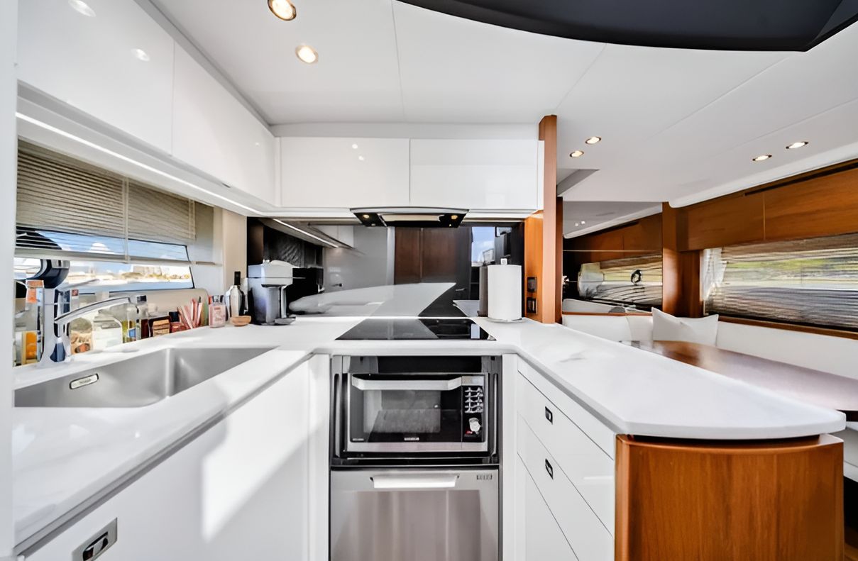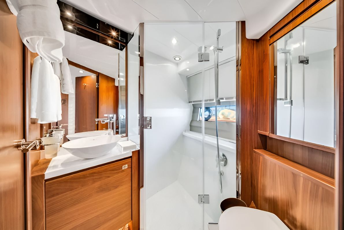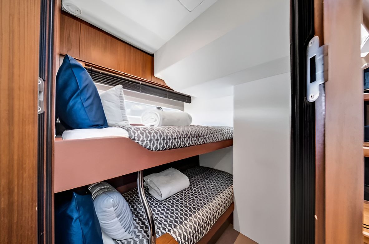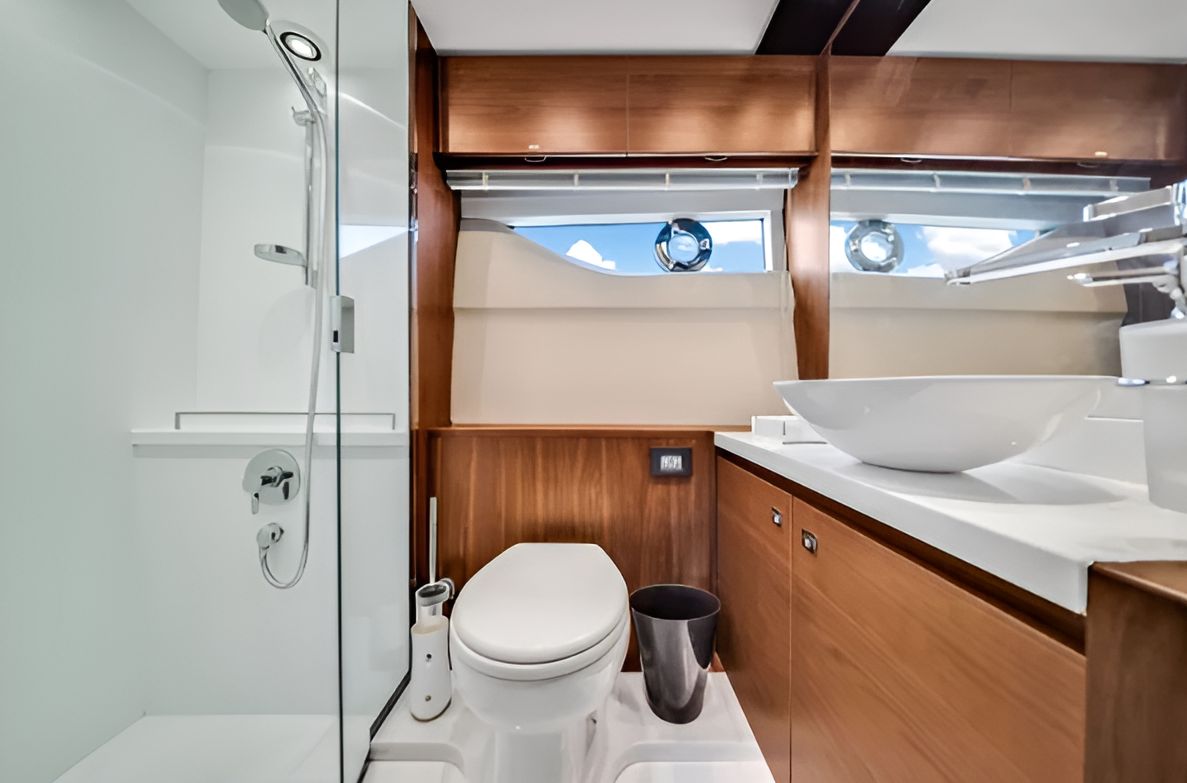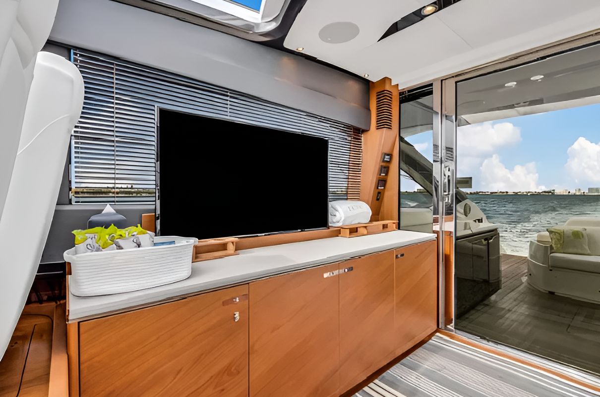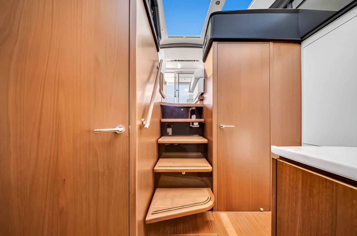 The V58 showcases dynamic exterior styling as well as offering the high performance synonymous with all V Class sports yachts. Fitted with twin Volvo D13-900 engines, the V58 is capable of achieving speeds of up to 37 knots. The main deck saloon comes complete with a generous U-shaped sofa around a dining table with a sideboard unit with glass and bottle storage and refrigerator opposite as well as a 46″ LED TV on an electric raise/lower mechanism. Below decks her large hull windows let light pour into the beautifully crafted lower accommodation.