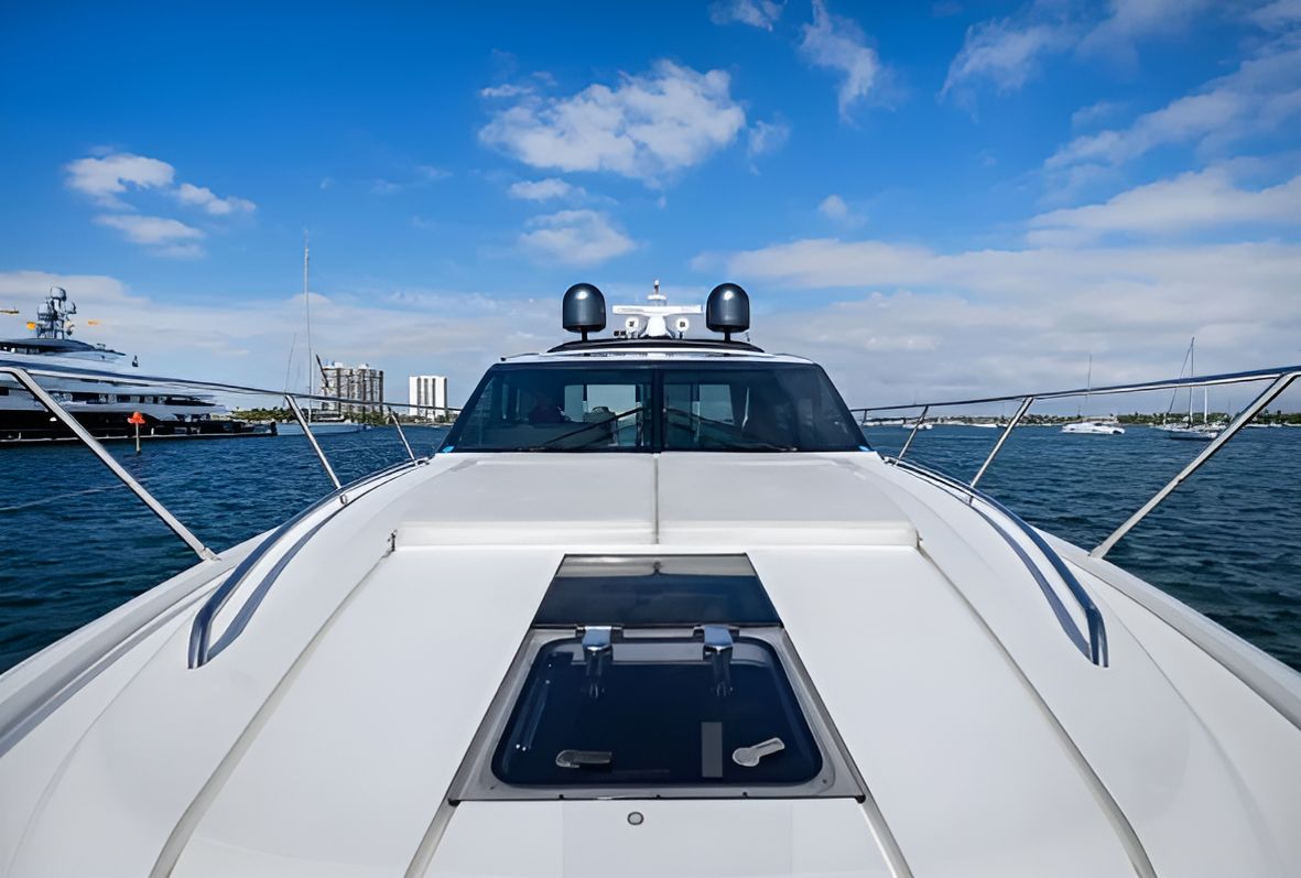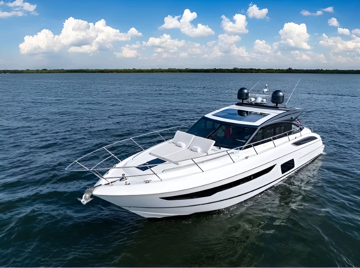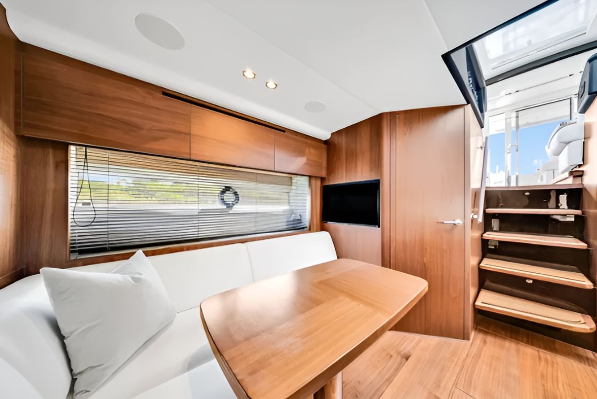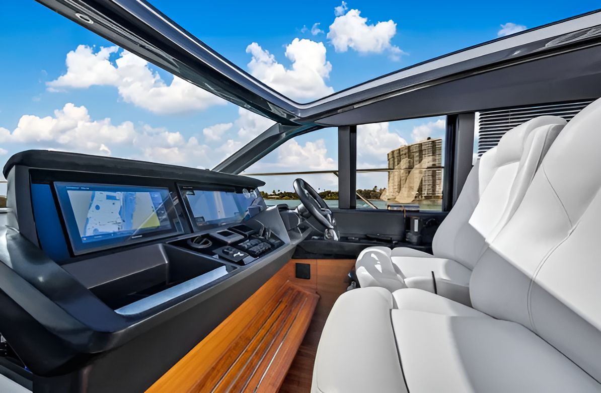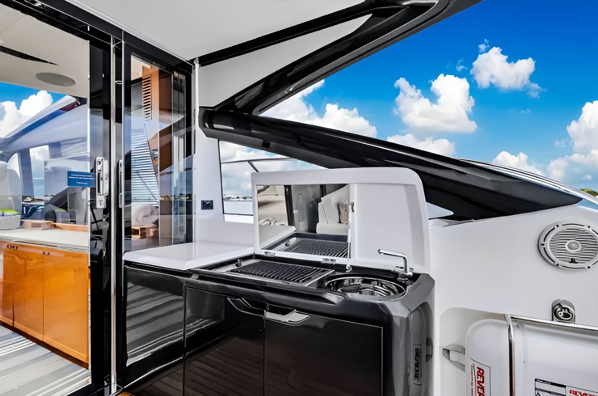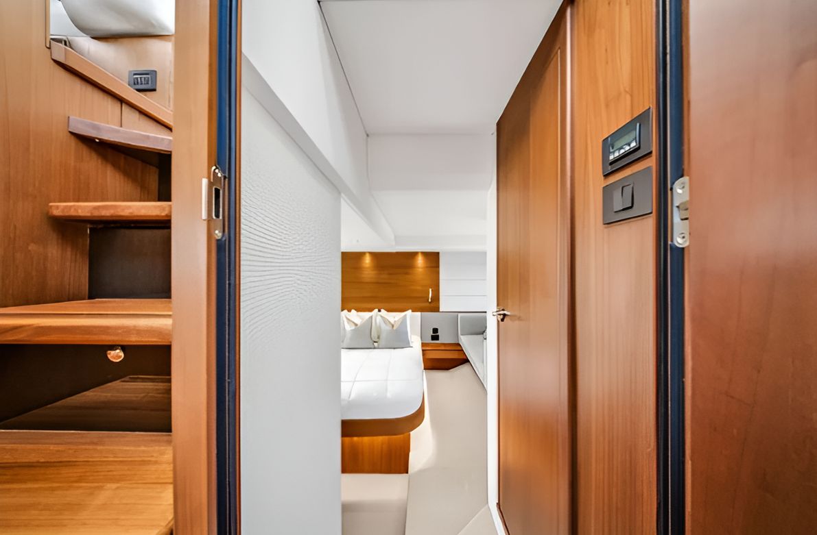 The V58 showcases dynamic exterior styling as well as offering the high performance synonymous with all V Class sports yachts. Fitted with twin Volvo D13-900 engines, the V58 is capable of achieving speeds of up to 37 knots. The main deck saloon comes complete with a generous U-shaped sofa around a dining table with a sideboard unit with glass and bottle storage and refrigerator opposite as well as a 46″ LED TV on an electric raise/lower mechanism. Below decks her large hull windows let light pour into the beautifully crafted lower accommodation.