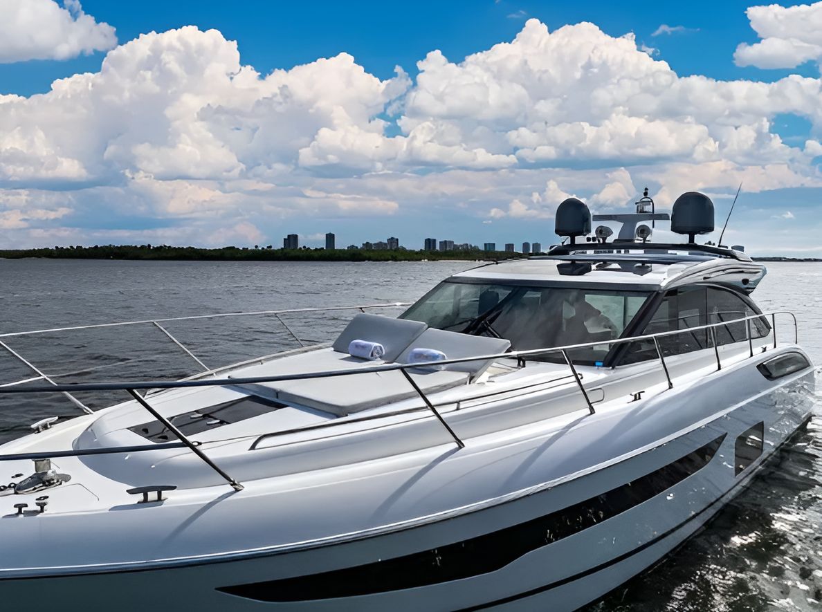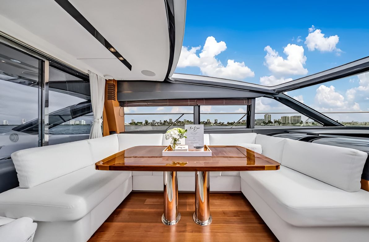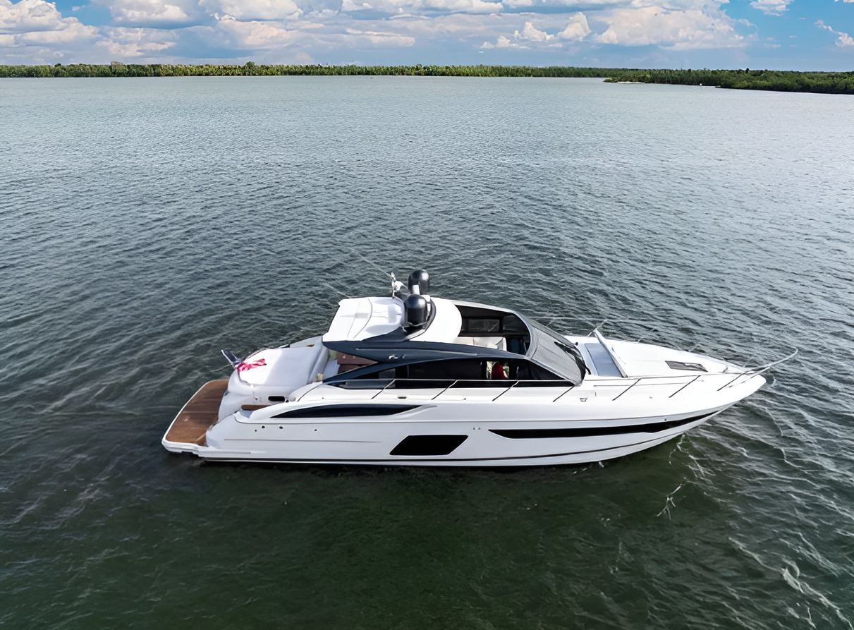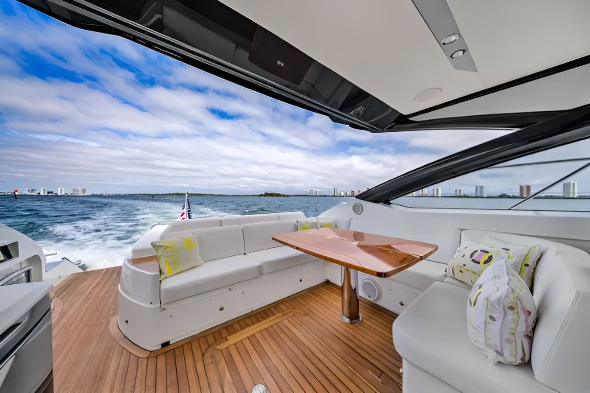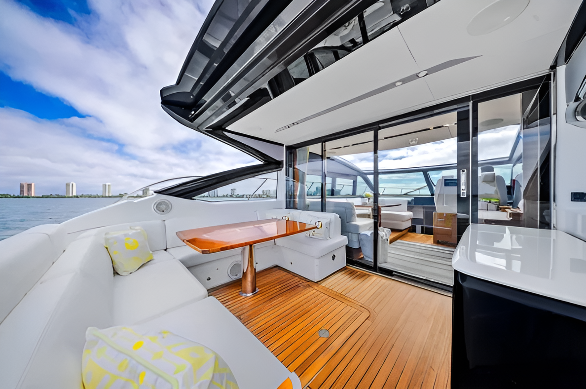 The V58 showcases dynamic exterior styling as well as offering the high performance synonymous with all V Class sports yachts. Fitted with twin Volvo D13-900 engines, the V58 is capable of achieving speeds of up to 37 knots. The main deck saloon comes complete with a generous U-shaped sofa around a dining table with a sideboard unit with glass and bottle storage and refrigerator opposite as well as a 46″ LED TV on an electric raise/lower mechanism. Below decks her large hull windows let light pour into the beautifully crafted lower accommodation.
