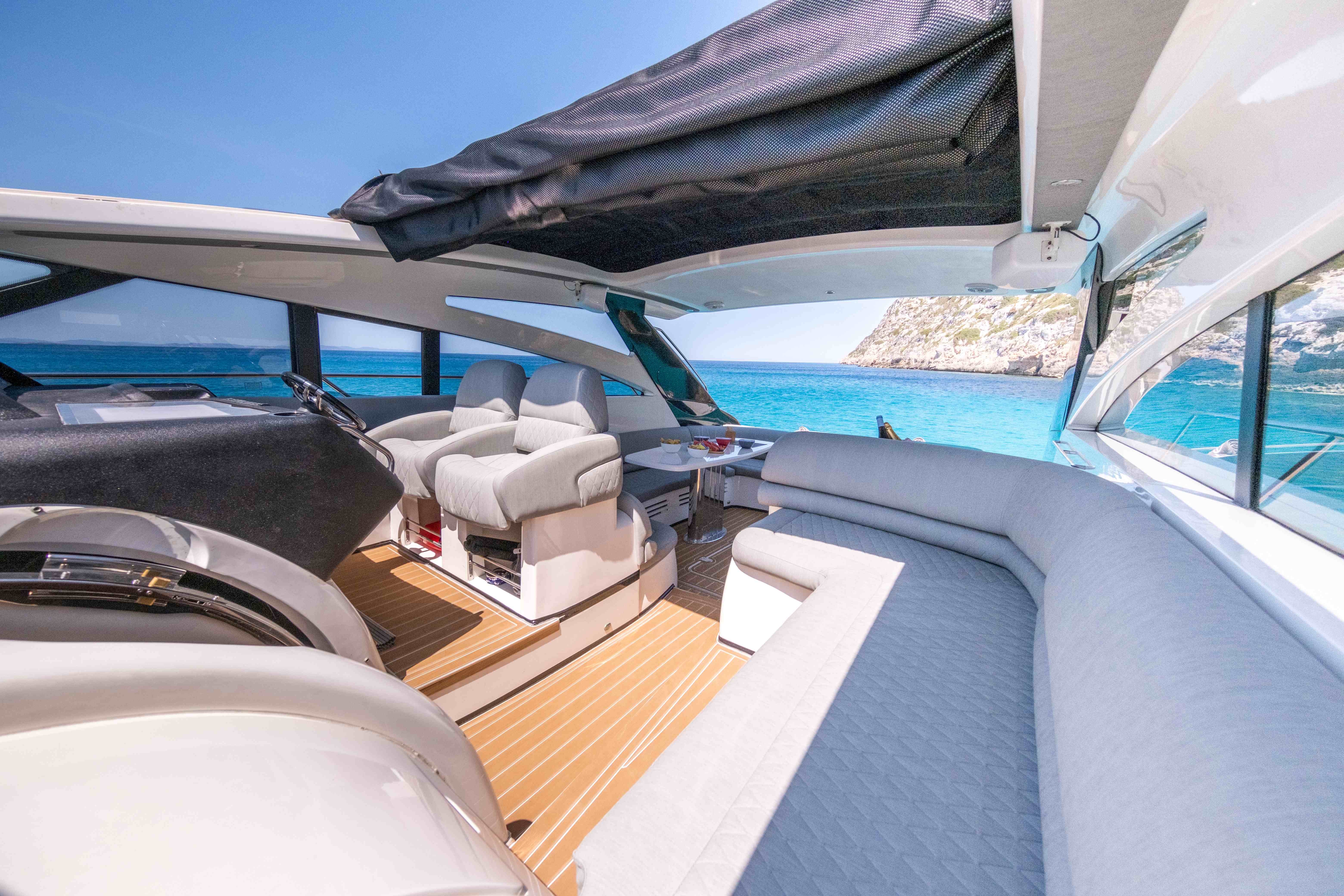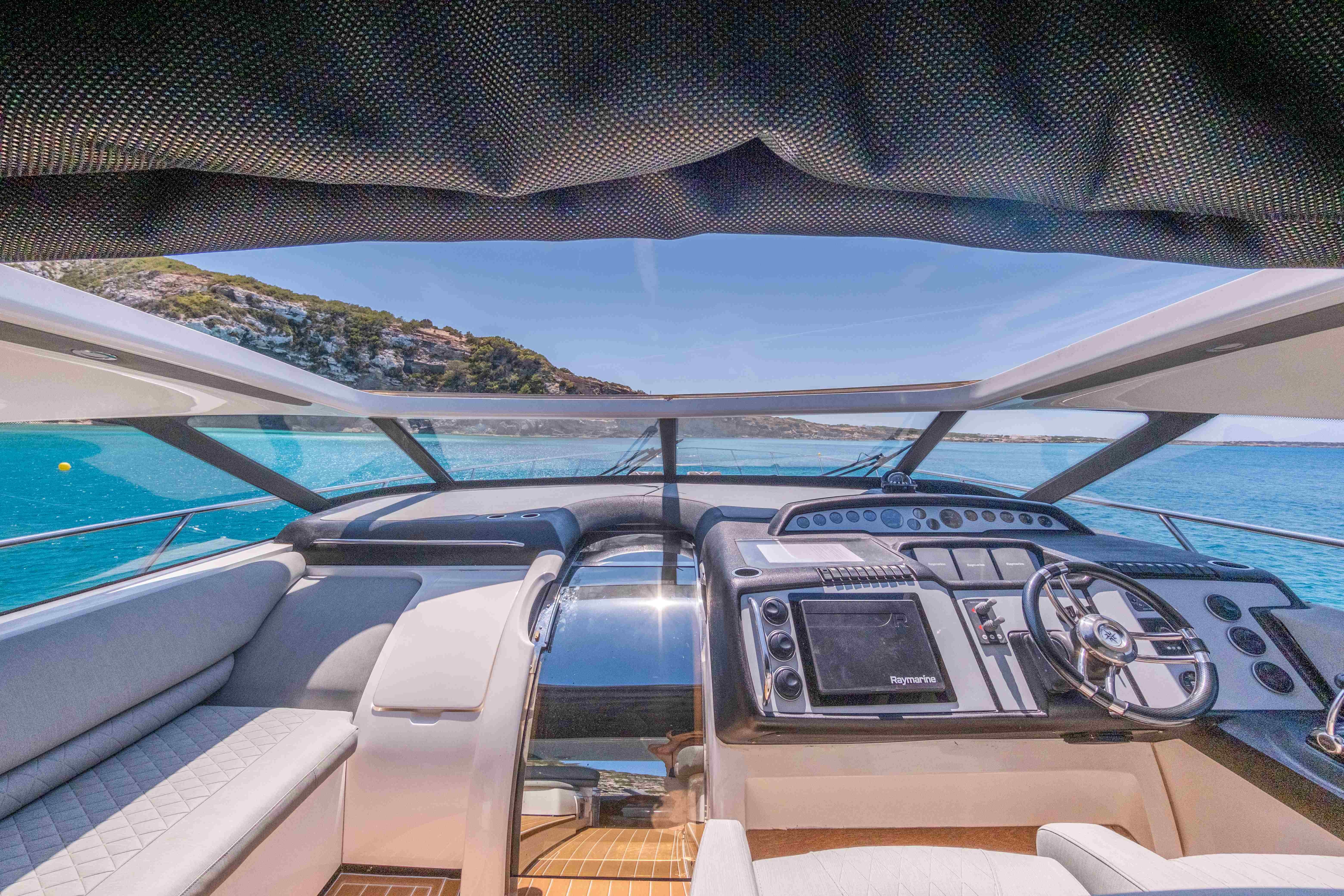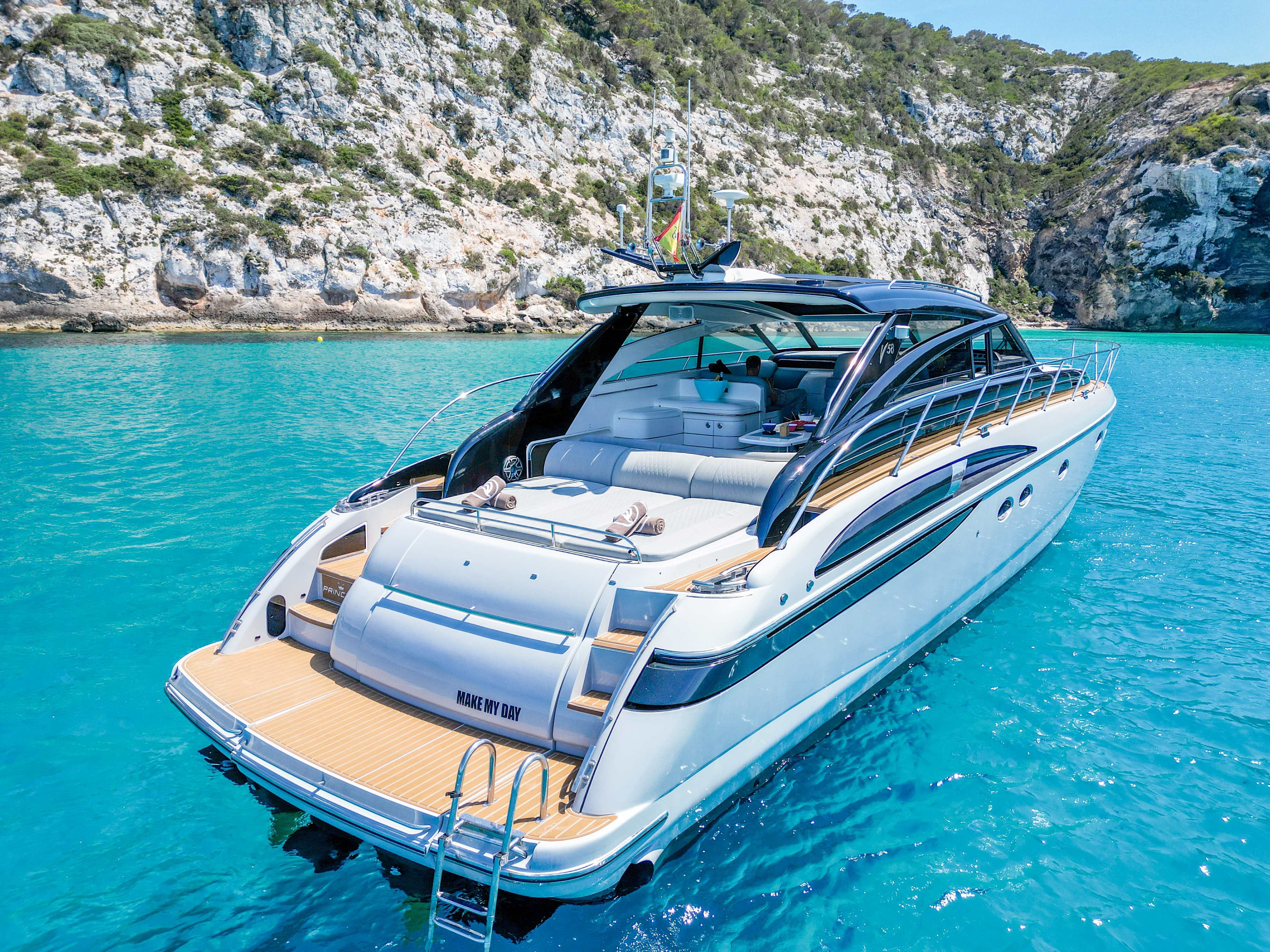 Princess V58 “Make My Day” offers the perfect blend of performance, luxury, and space for an unforgettable day cruising Ibiza and Formentera. With her sleek profile, open deck layout, and spacious interiors, she is designed for both speed and comfort. The expansive sunbathing areas at the bow and stern, paired with a generous cockpit lounge and alfresco dining space, make her ideal for soaking up the Mediterranean sun. Inside, her modern salon and well-appointed cabins provide a stylish retreat from the heat, while the fully equipped galley ensures convenience onboard.