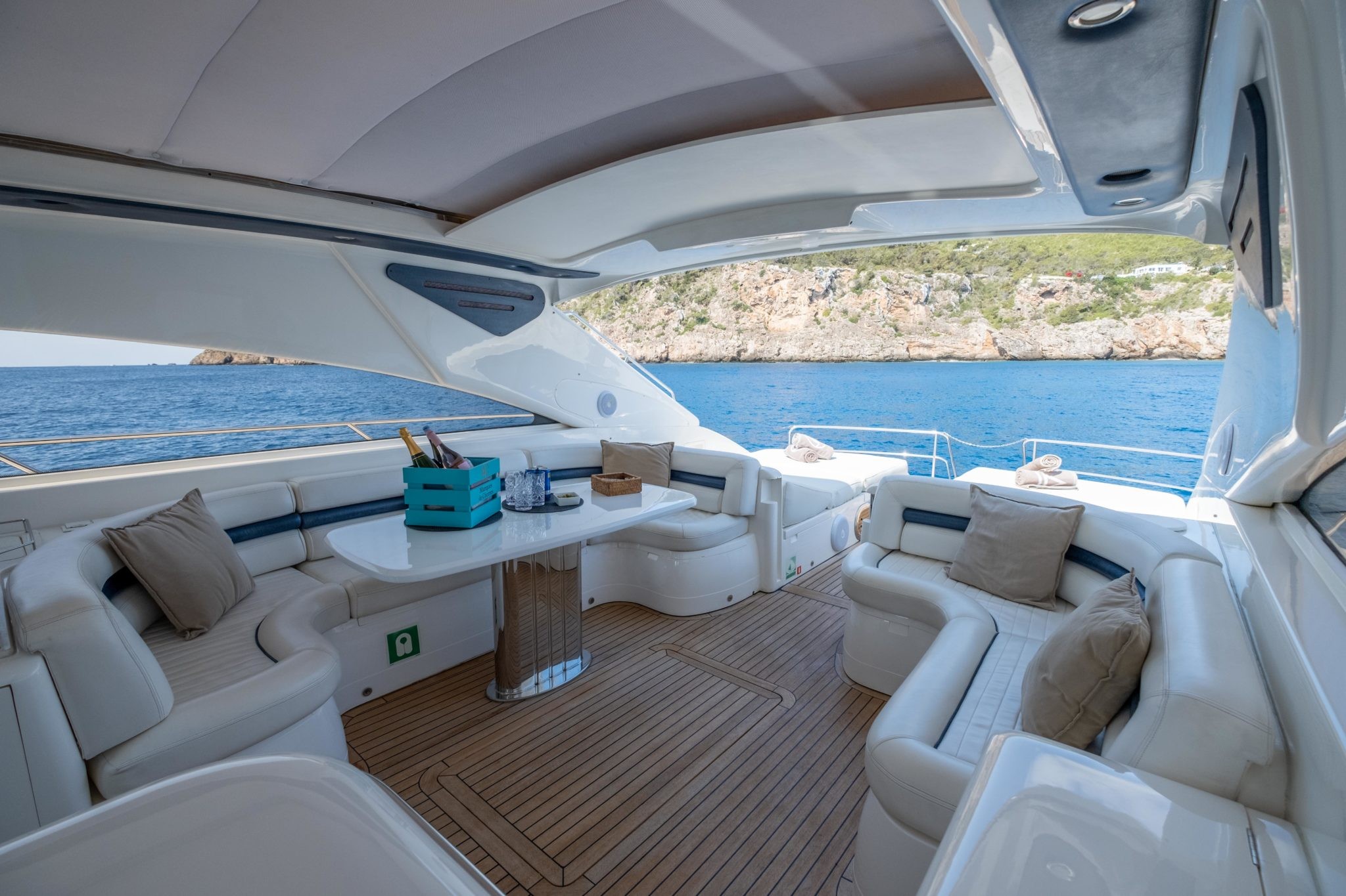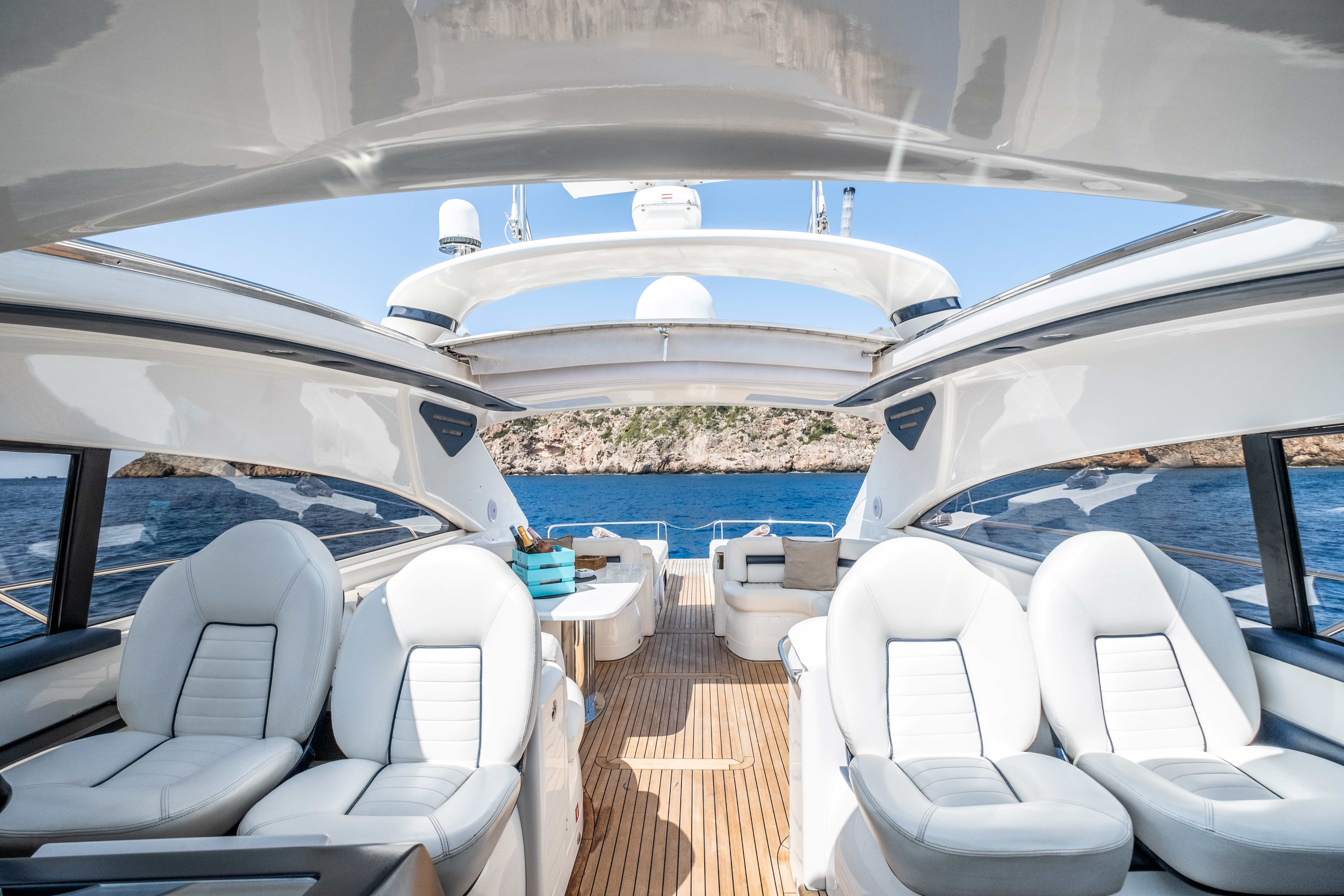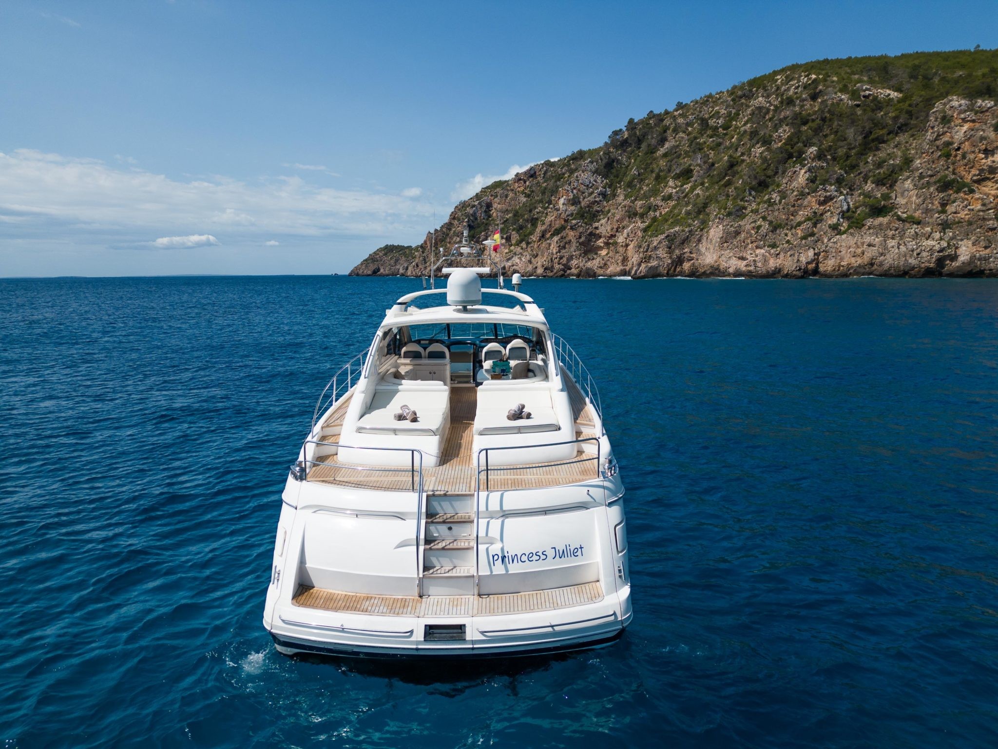 V65 Princess Juliet is a sleek and stylish 20-metre motor yacht that blends timeless Princess Yachts craftsmanship with exhilarating performance. With her powerful engines and deep-V hull, she delivers a smooth, fast cruising experience, ideal for exploring the Balearic coastline. Her spacious open deck layout features large sunbathing areas at the bow and stern, an inviting cockpit with alfresco dining, and a retractable sunroof for enjoying the Mediterranean sun. Inside, Juliet offers a bright and comfortable saloon with plush seating, a fully equipped galley, and elegant cabins accommodating guests in comfort. Designed for both relaxation and adventure, she is perfect for day charters or extended cruising, combining performance, luxury, and space in equal measure.
