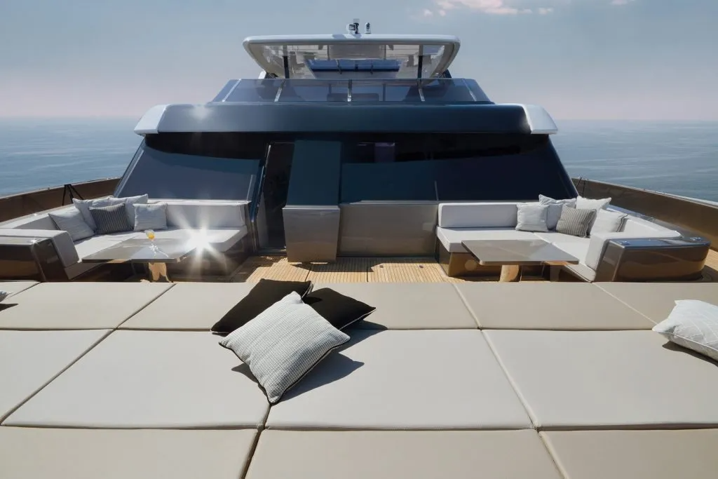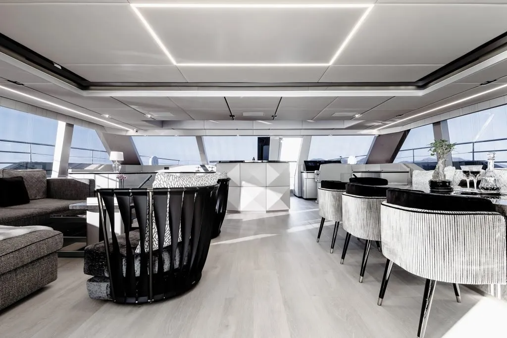 Launched in 2020, this luxury 80 Sunreef Power boasts a massive living space and stands out with its modern bespoke décor following a soothing, dark color scheme. Owing to her open layout, the exteriors of the power catamaran don comfortable seating all around, oversized sunpads, and shaded dining areas. The motor yacht features a three-cabin layout, including an opulent master suite and two airy guest cabins within the hulls. The crew cabins, galley, and pantry can be accessed directly from the aft cockpit to offer more privacy onboard. With 12m of beam, the 80 Sunreef Power offers plenty of lounging and dining space in the stern cockpit. Beneath the modular sofa, the power yacht’s aft garage houses a large jet ski and water toys. What is more is that the hydraulic swim platform carries the tender and provides for extra lounging space by the sea.