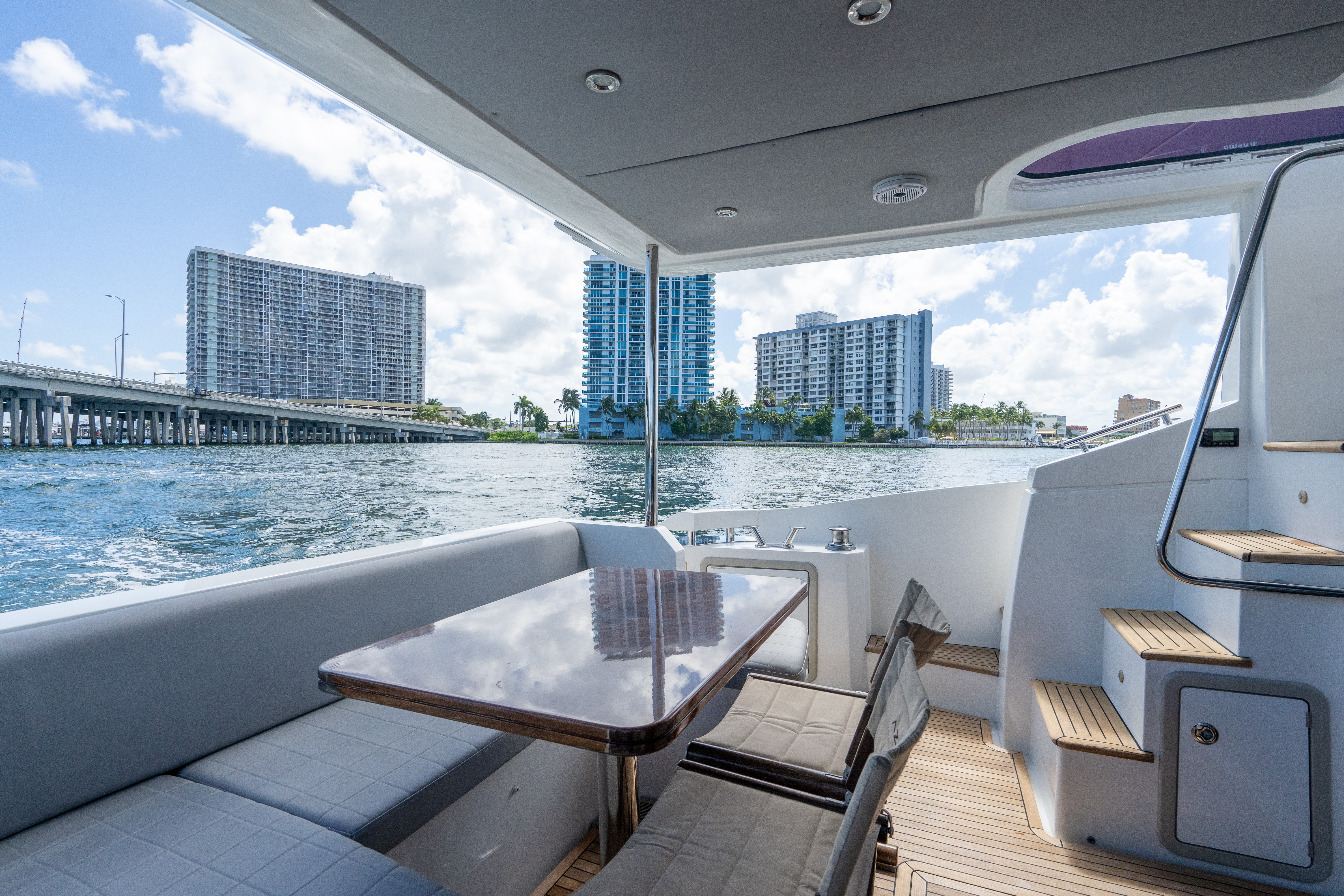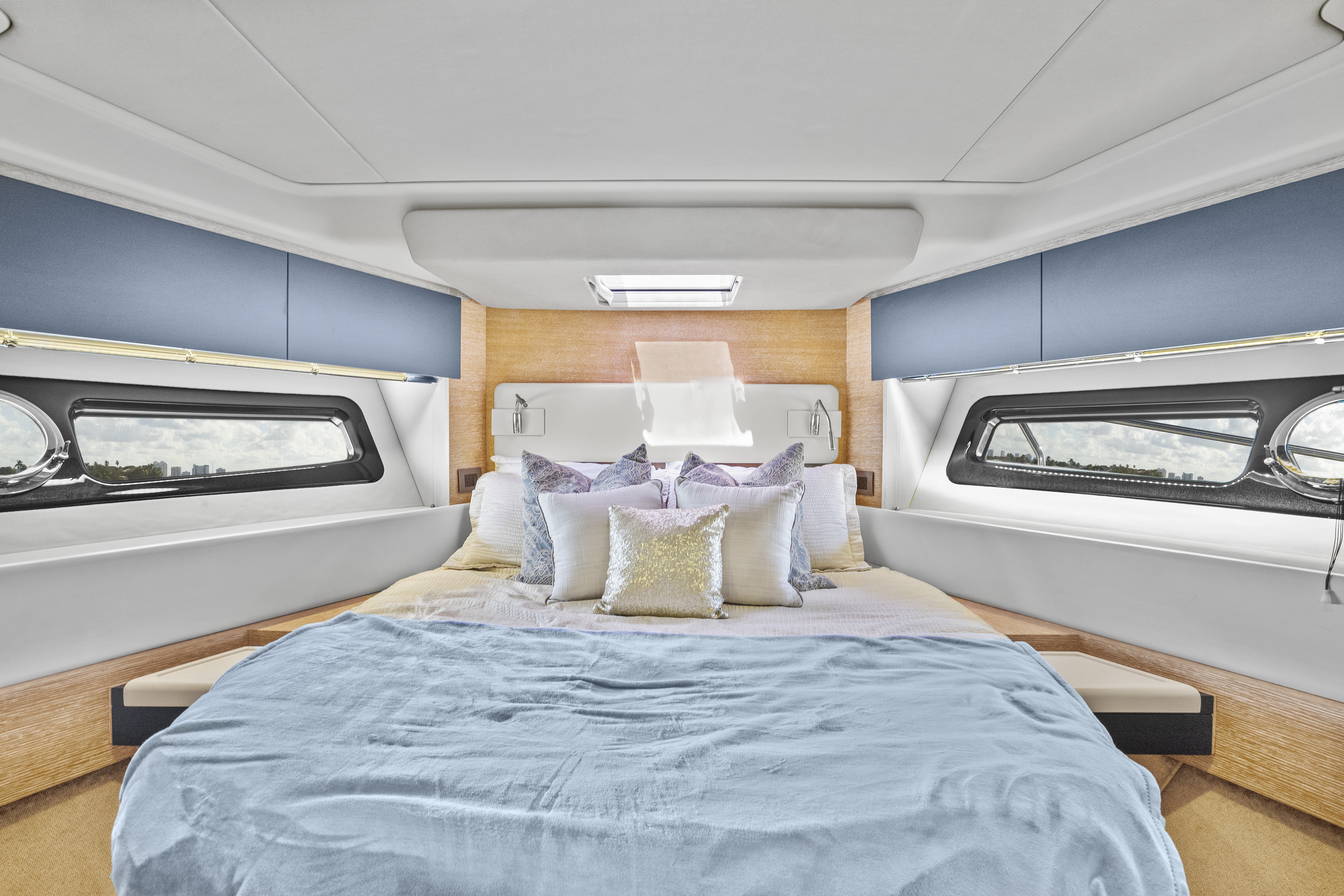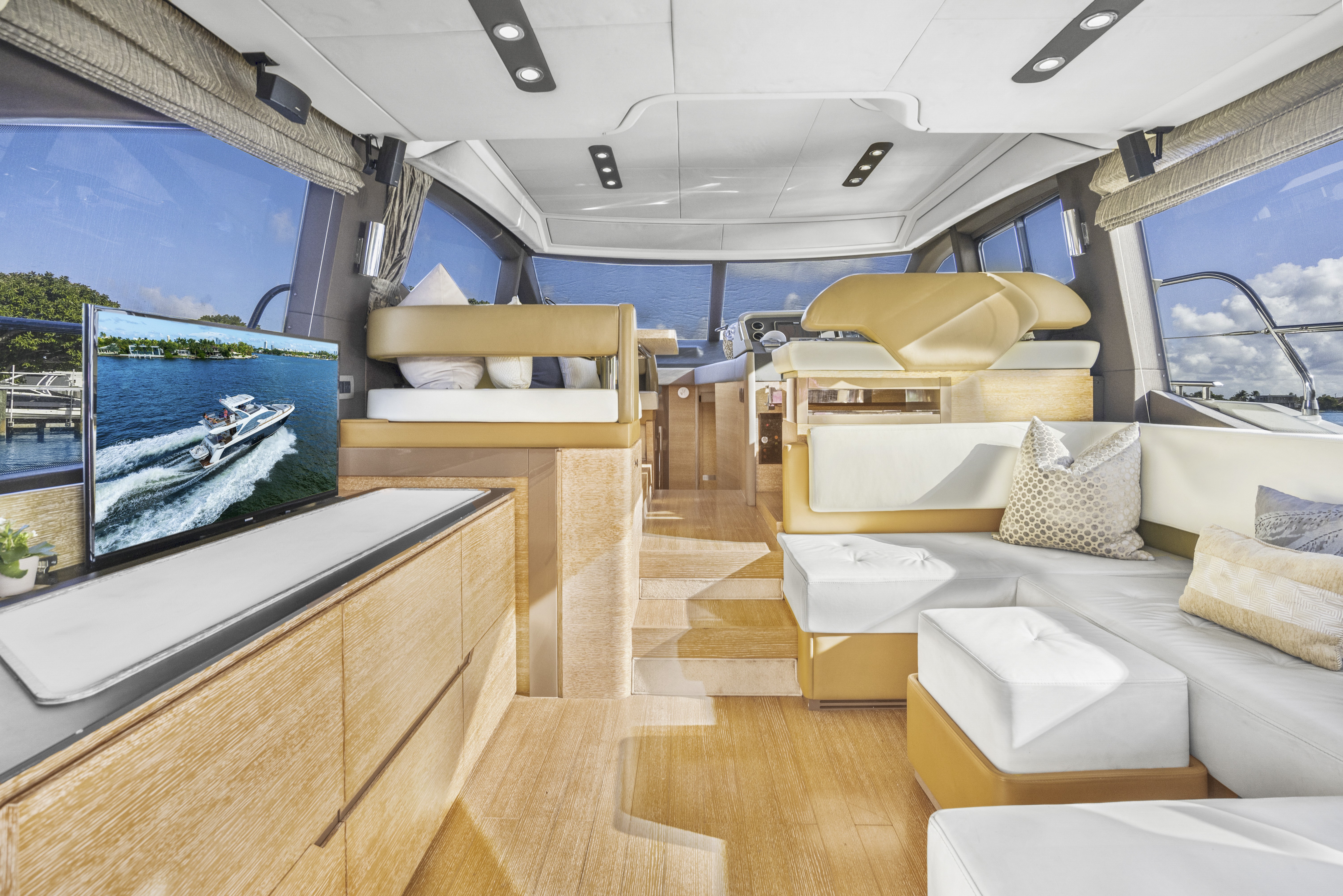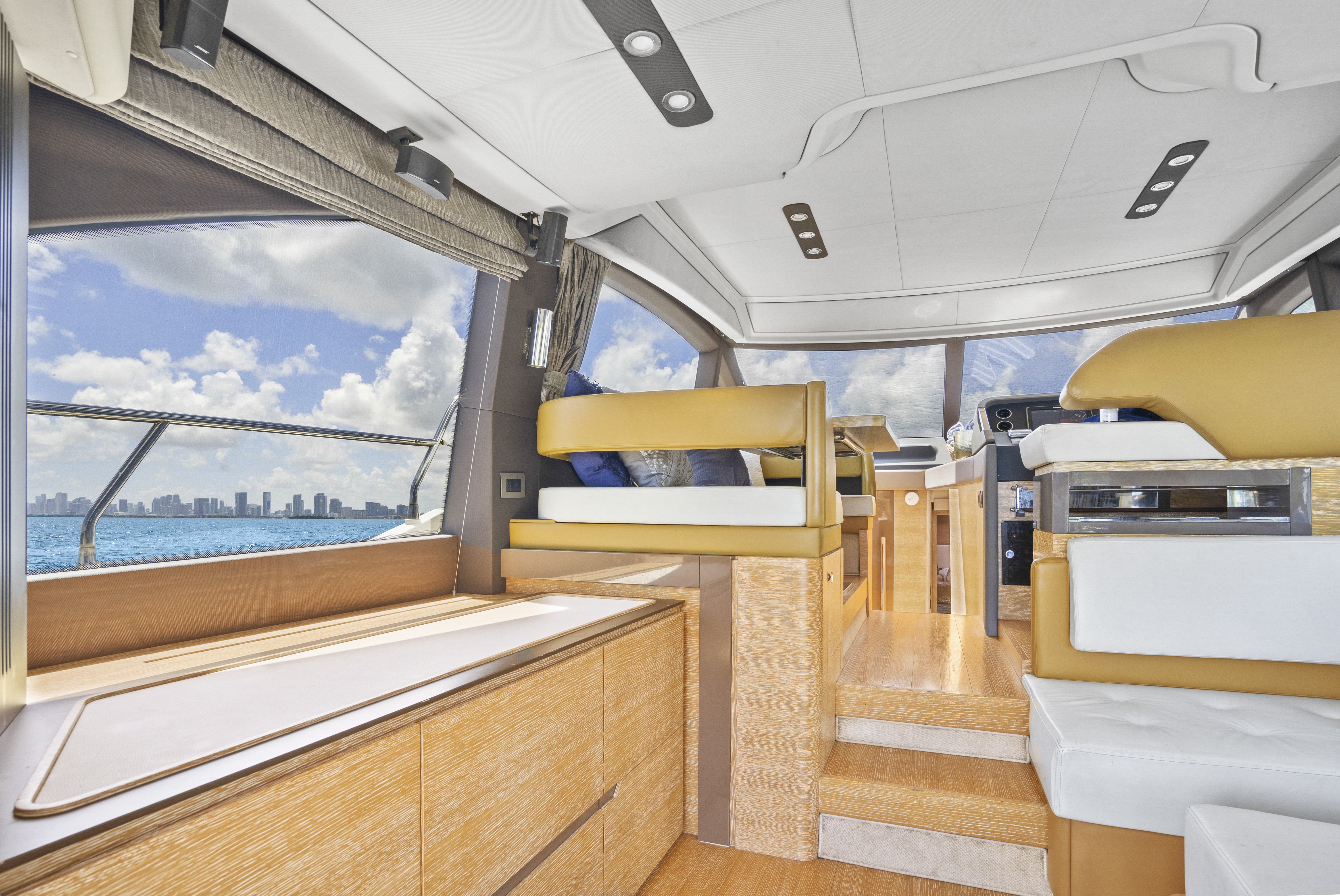 The 2015 Azimut 50 Fly is a 50-foot flybridge yacht, known for its spaciousness, comfortable layout, and great performance. Penned by renowned architect Pierluigi Ausonio and styled by Stefano Righini, the 50 Flybridge boasts a well-proportioned and streamlined hull with Azimut’s signature sweeping saloon windows and vertical stateroom glass. The glass offers wide views and magnifies the feeling of space.